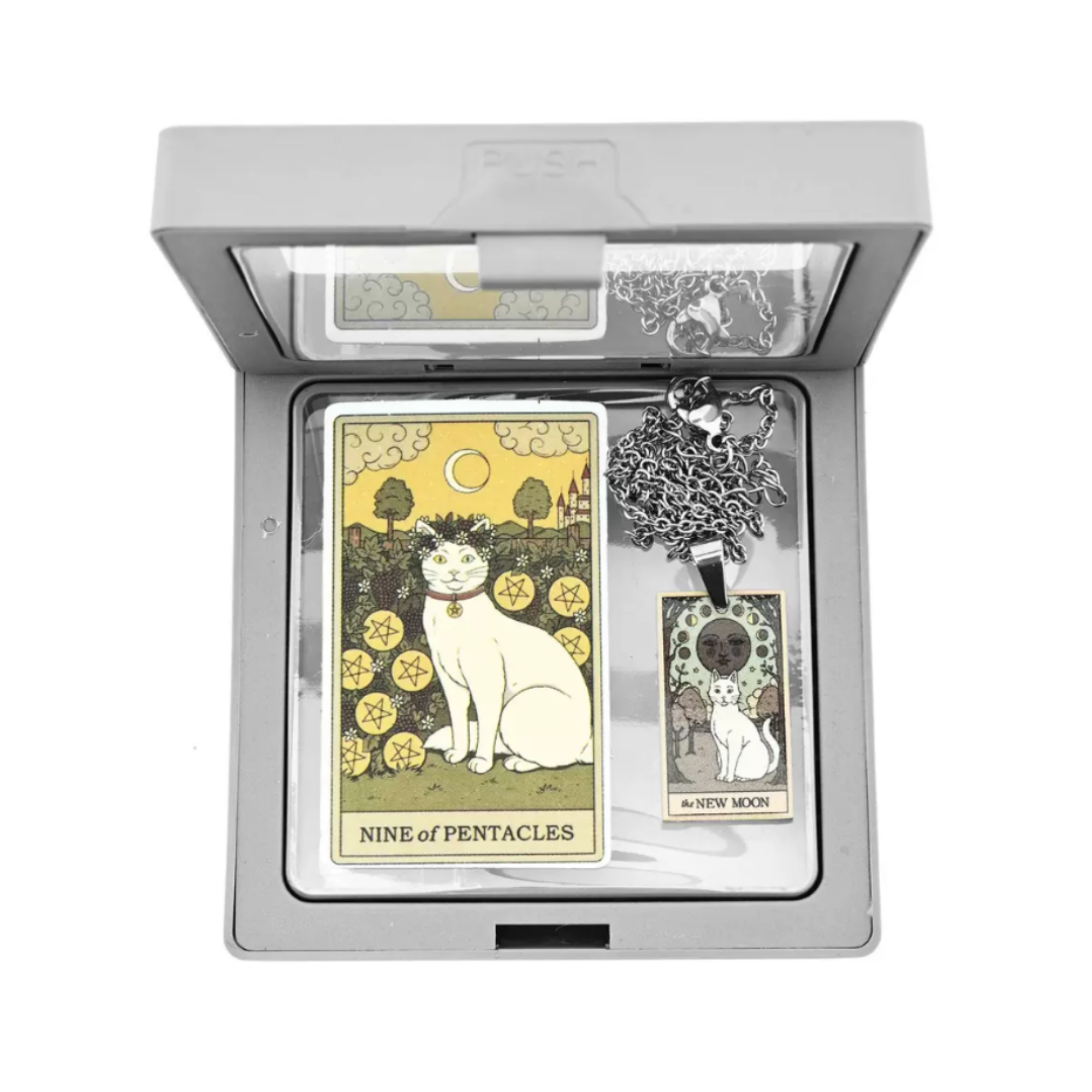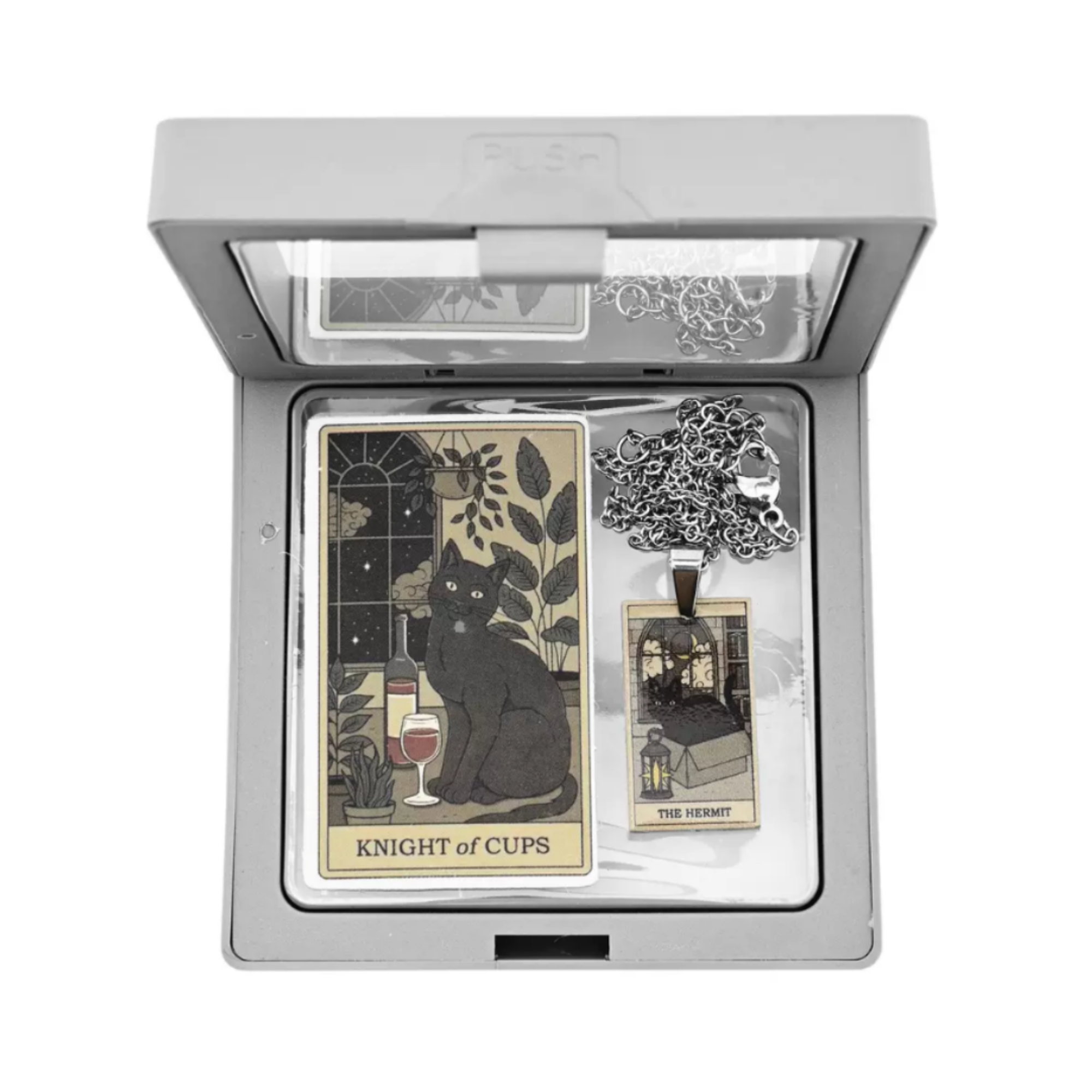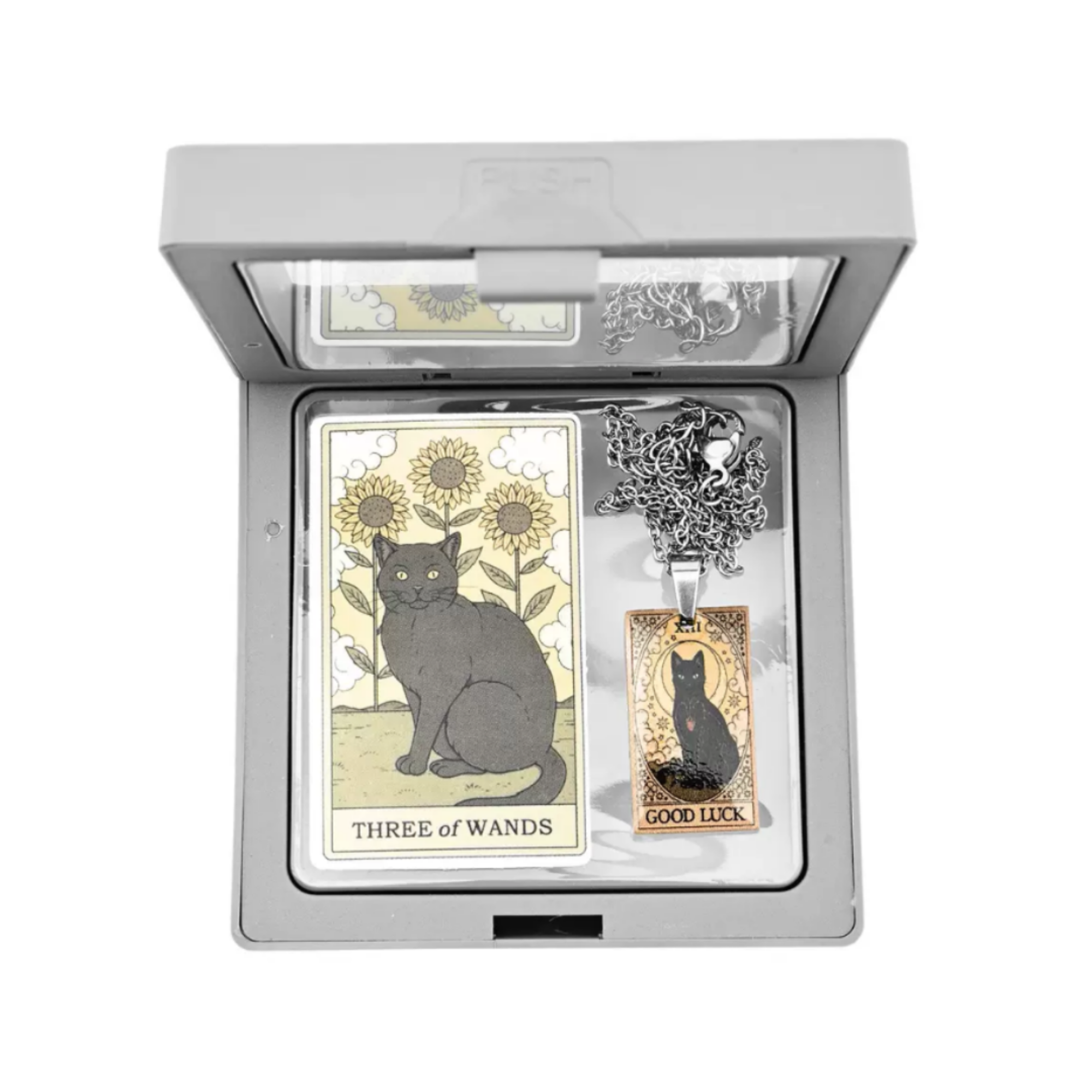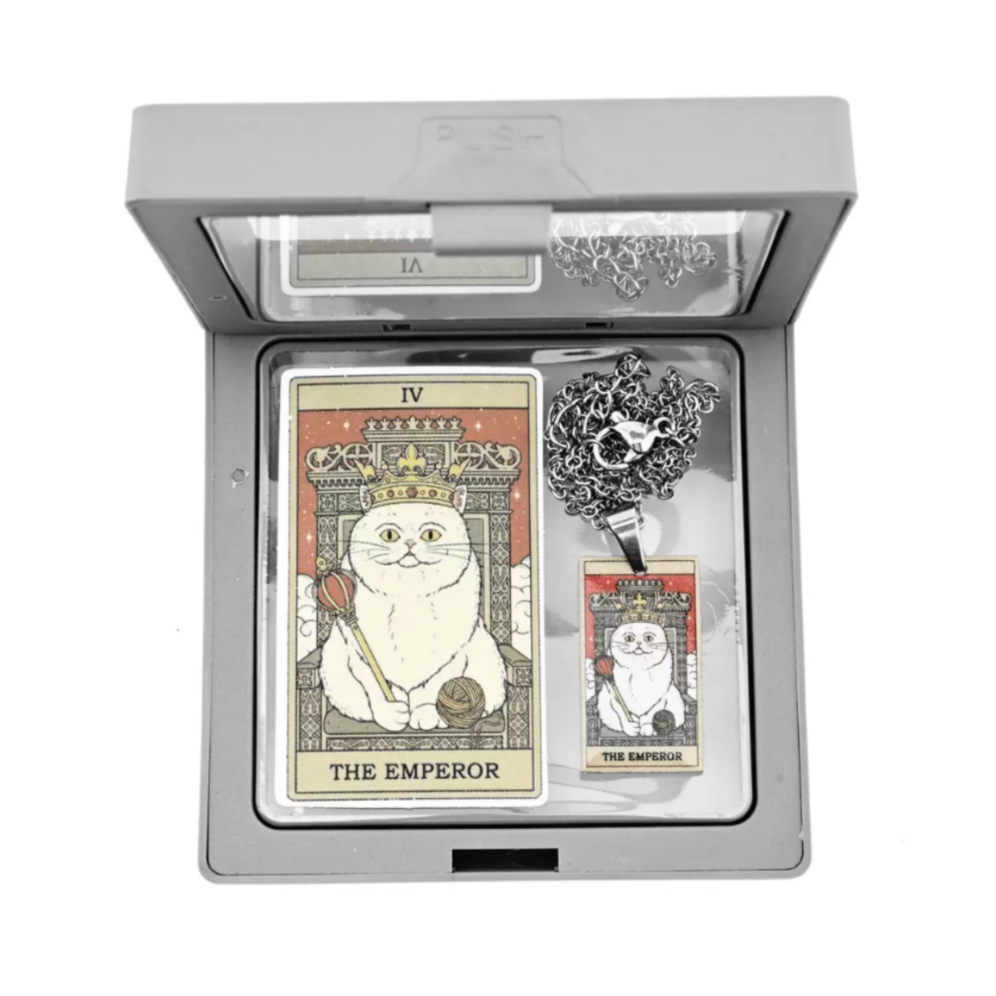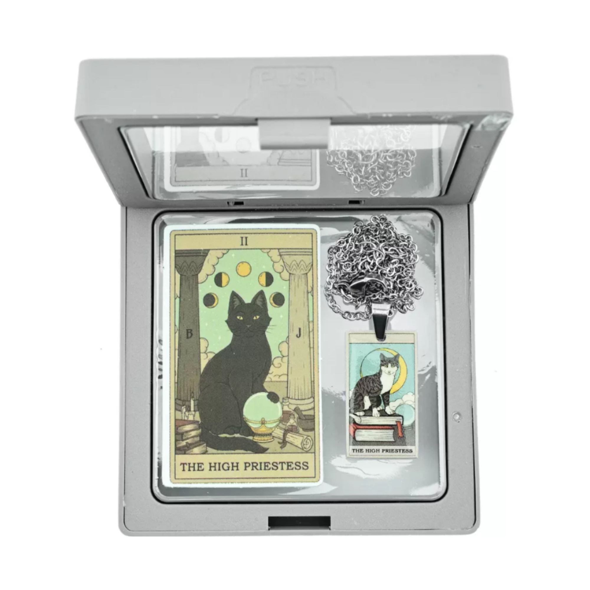 Box set of a necklace and the actual tarot card, it's the ideal gift for anyone who loves cats, cards, and a little cosmic magic.