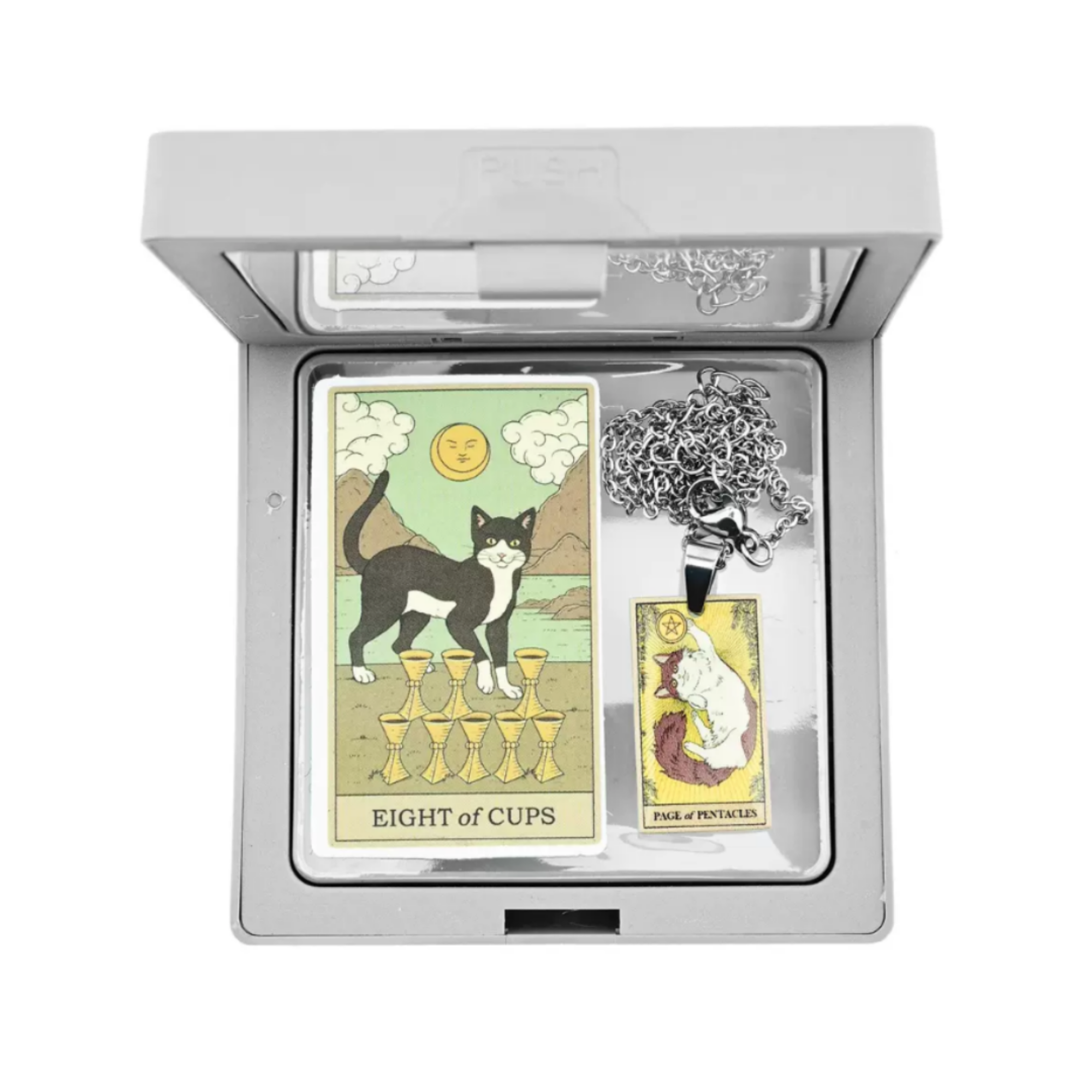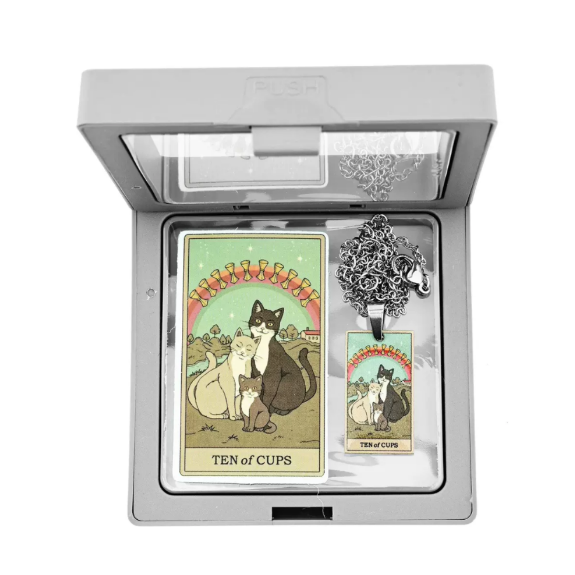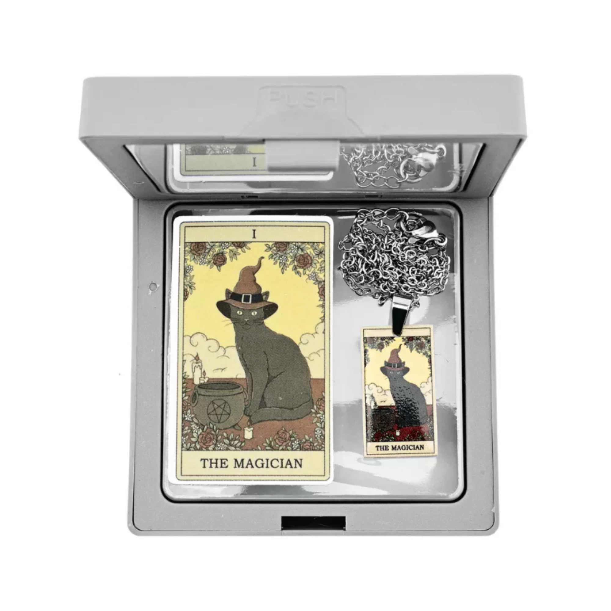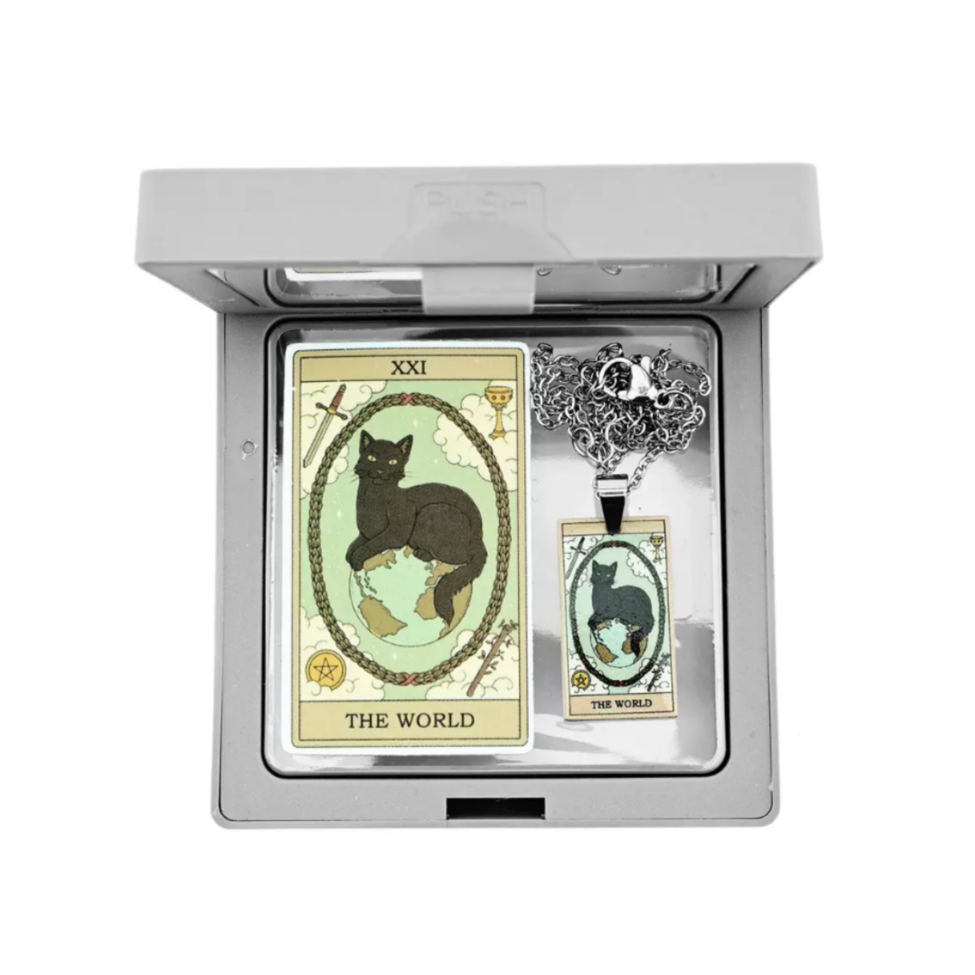 Box set of a necklace and the actual tarot card, it's the ideal gift for anyone who loves cats, cards, and a little cosmic magic.