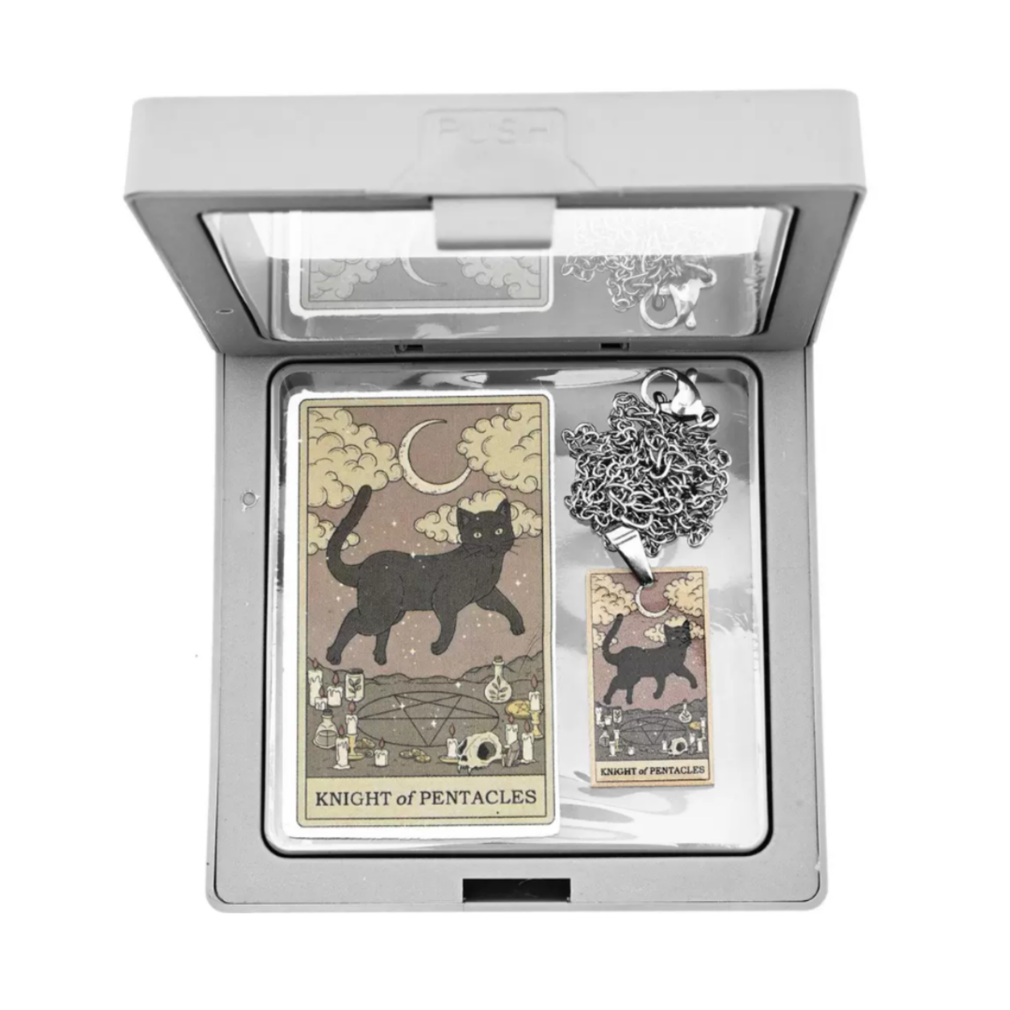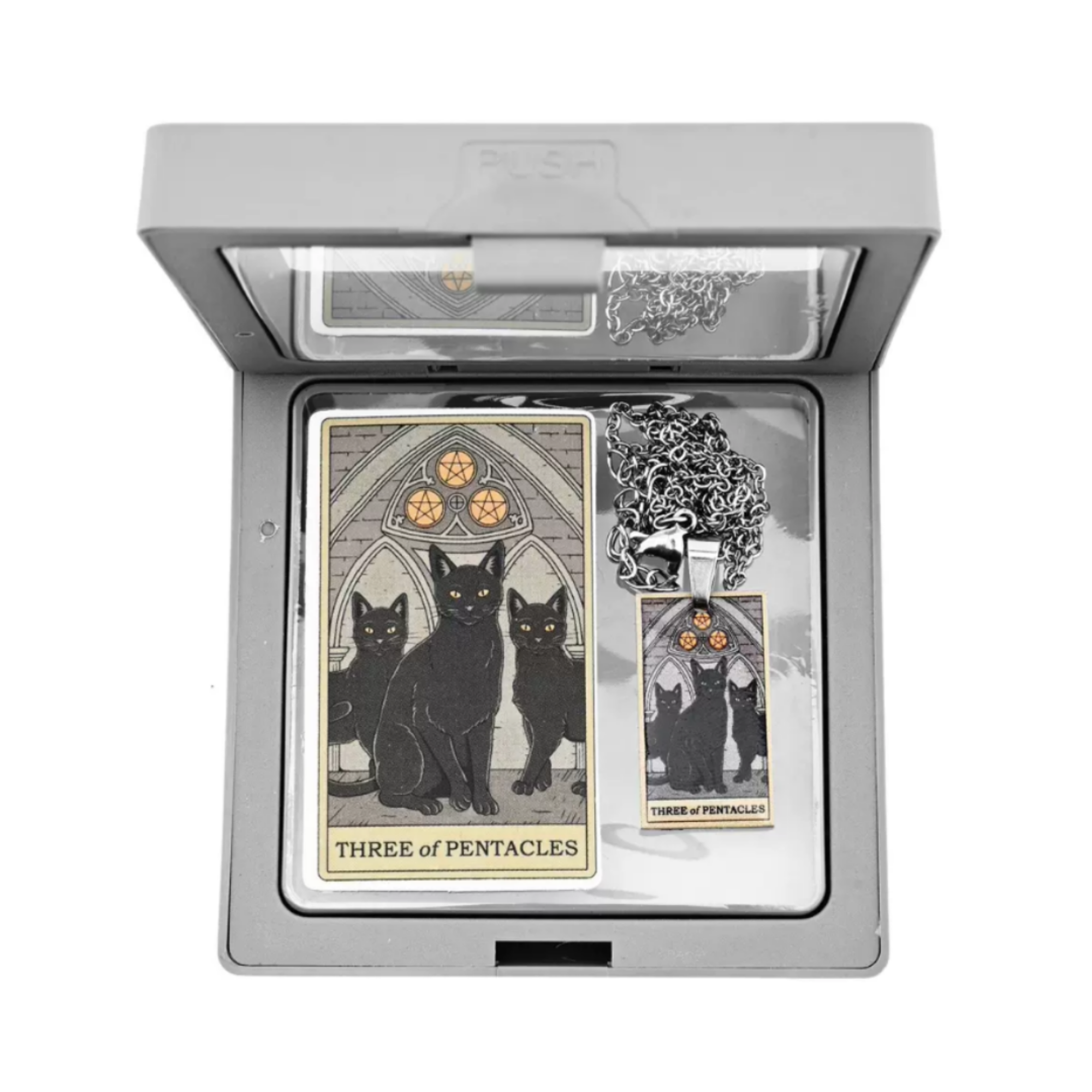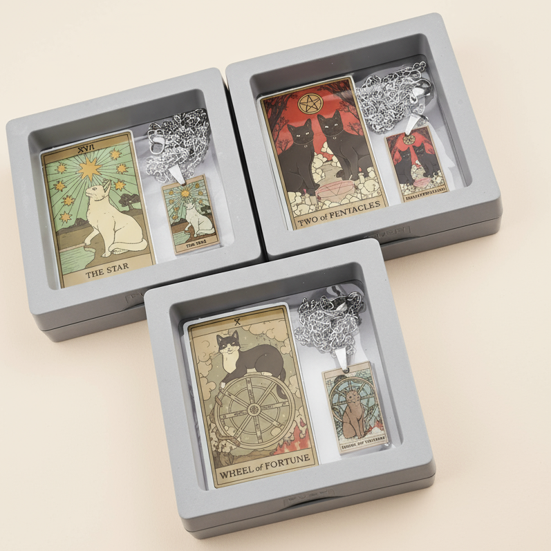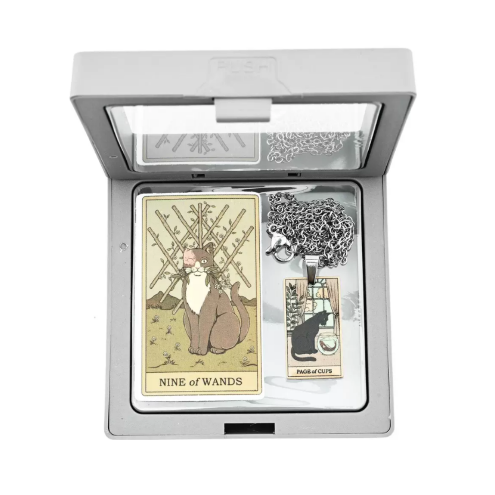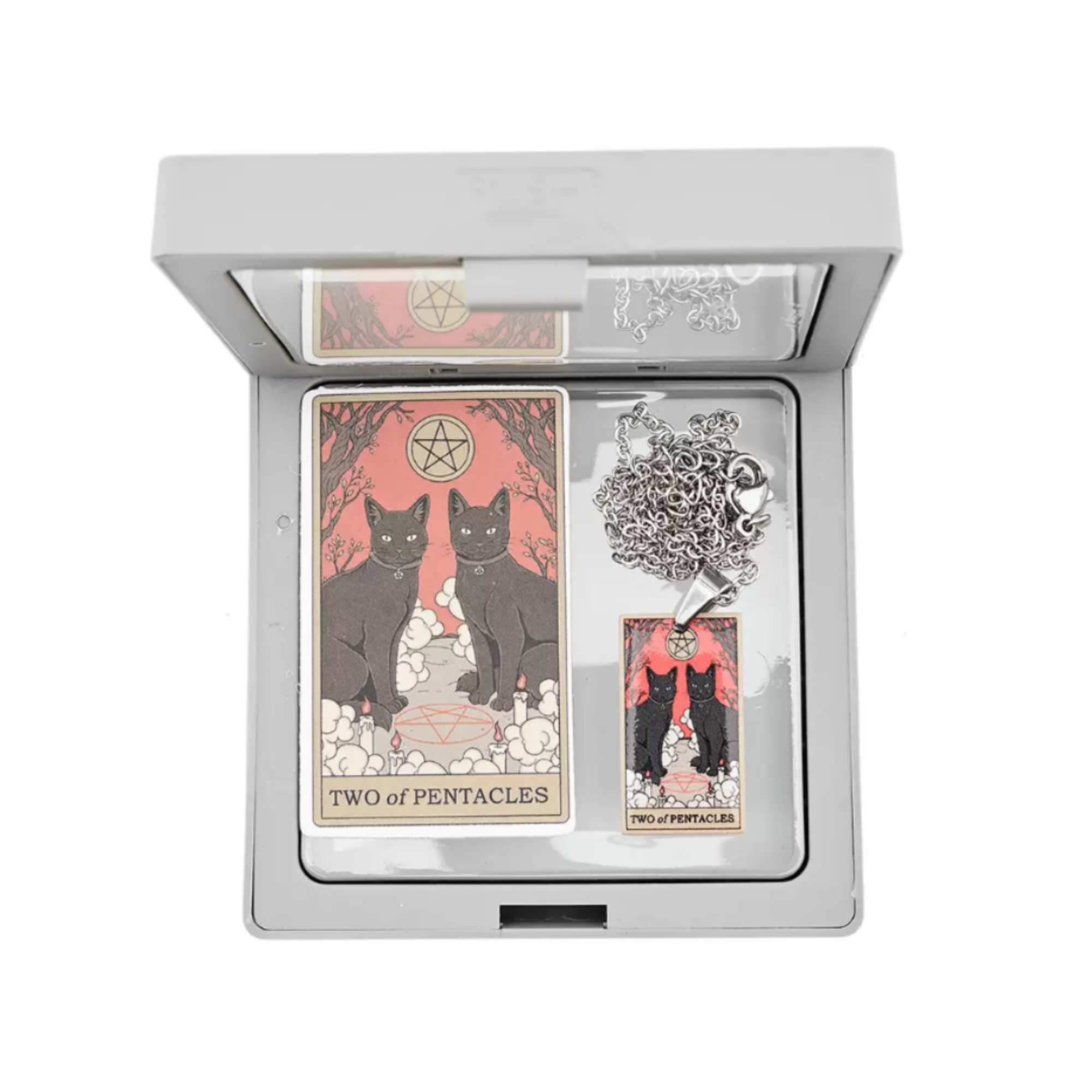 Box set of a necklace and the actual tarot card, it's the ideal gift for anyone who loves cats, cards, and a little cosmic magic.