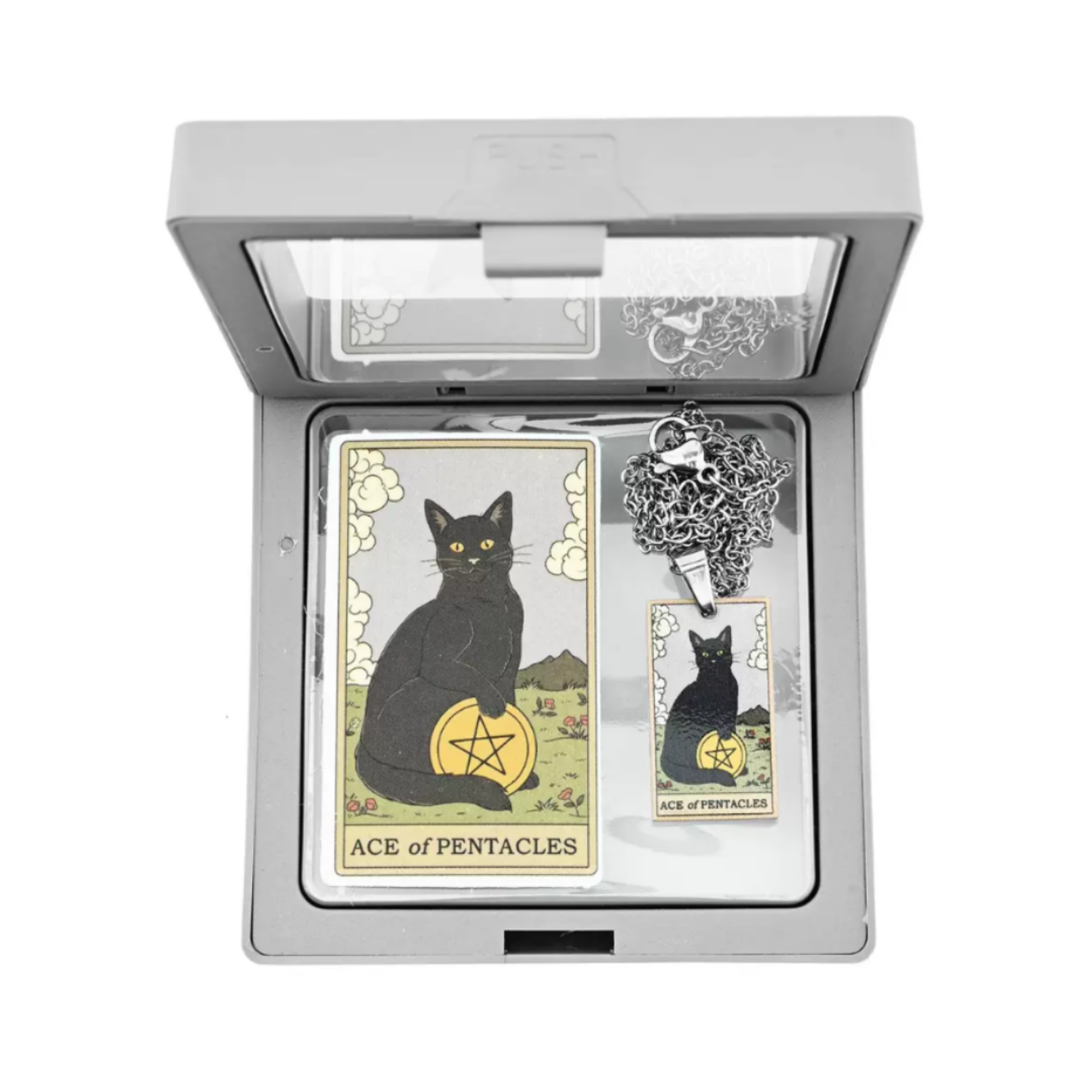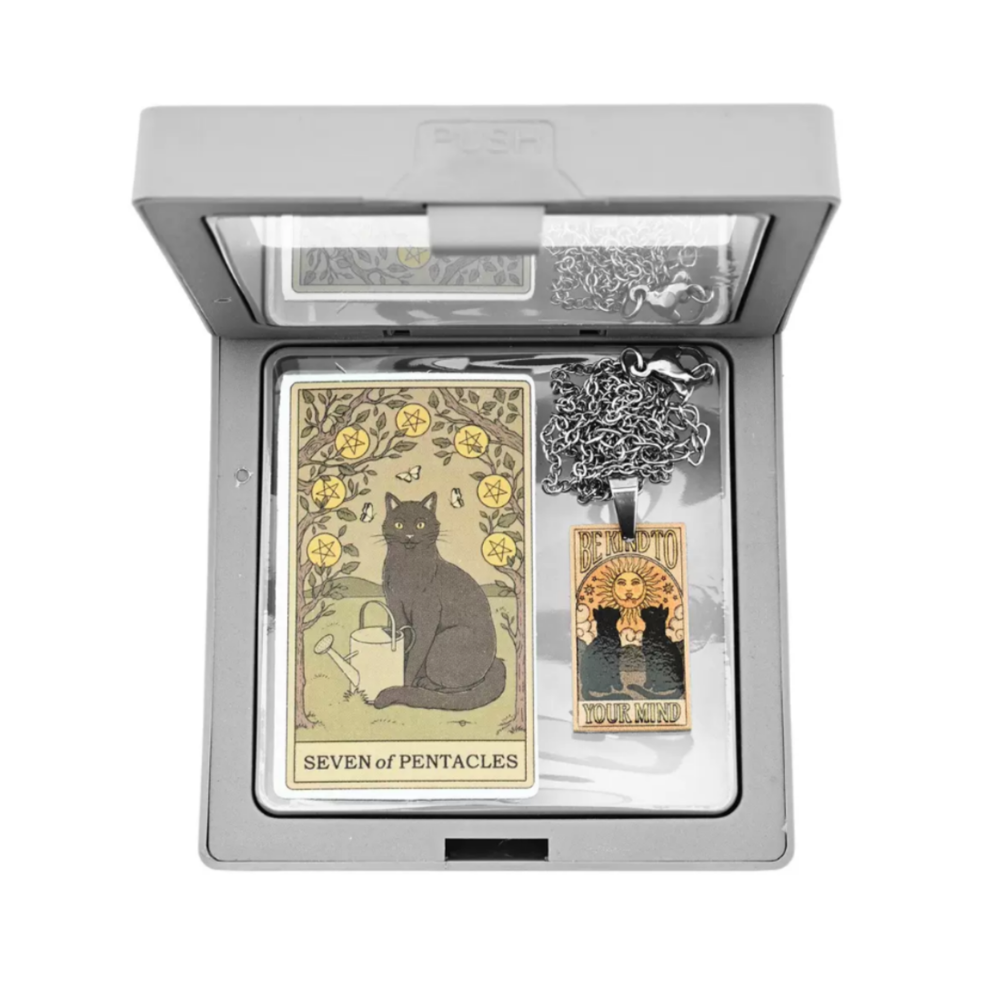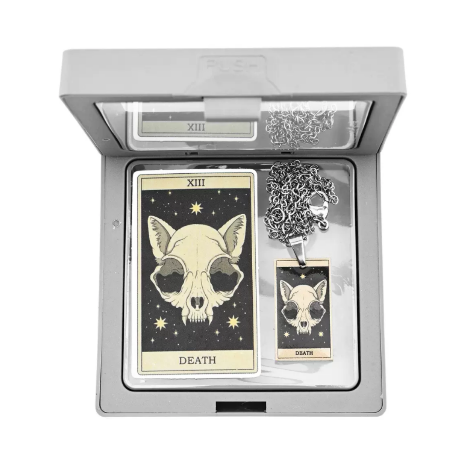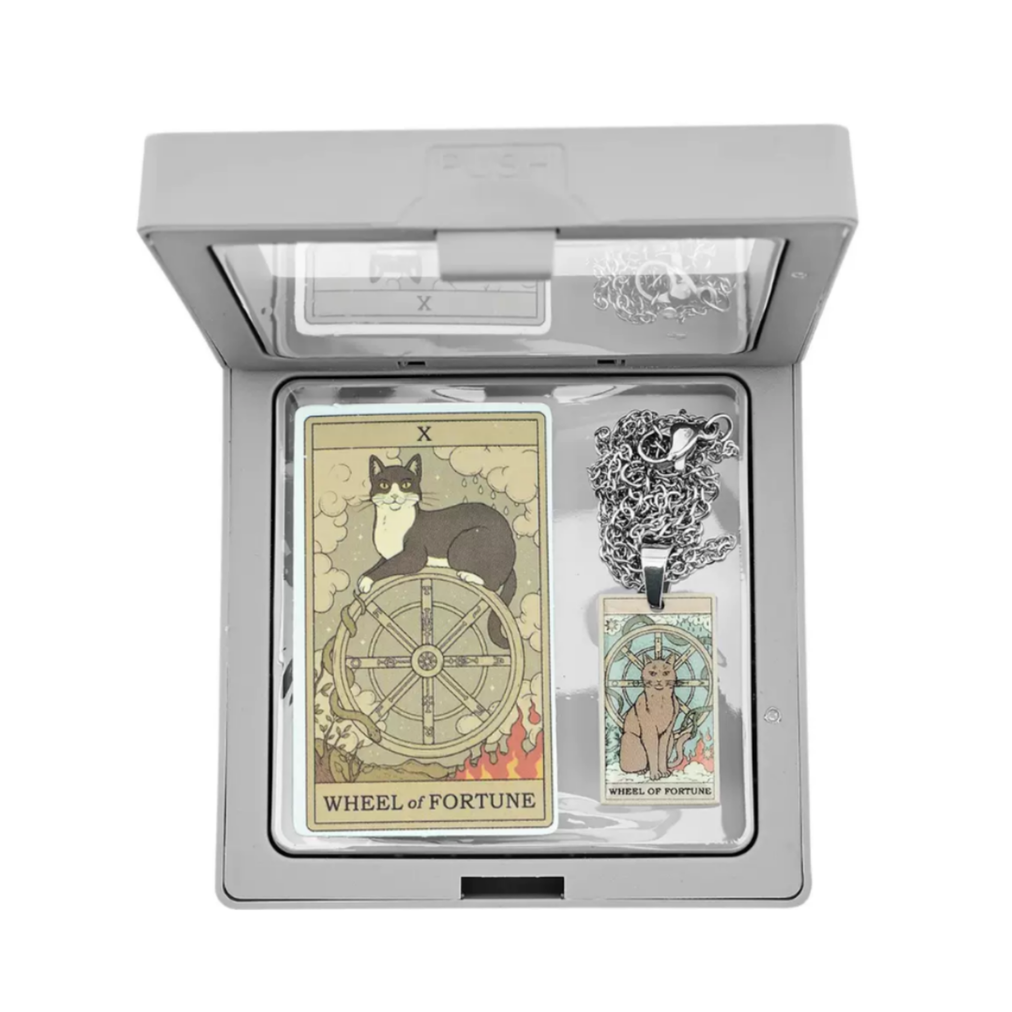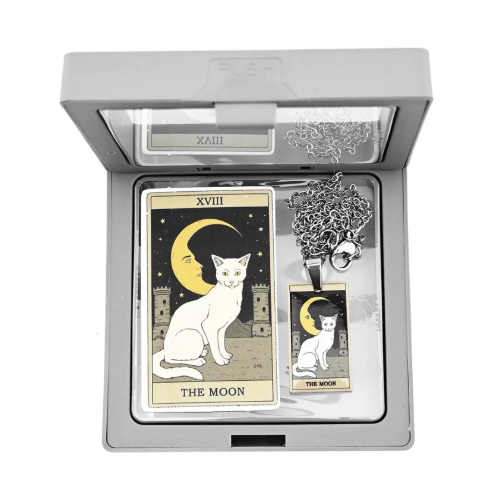 Box set of a necklace and the actual tarot card, it's the ideal gift for anyone who loves cats, cards, and a little cosmic magic.