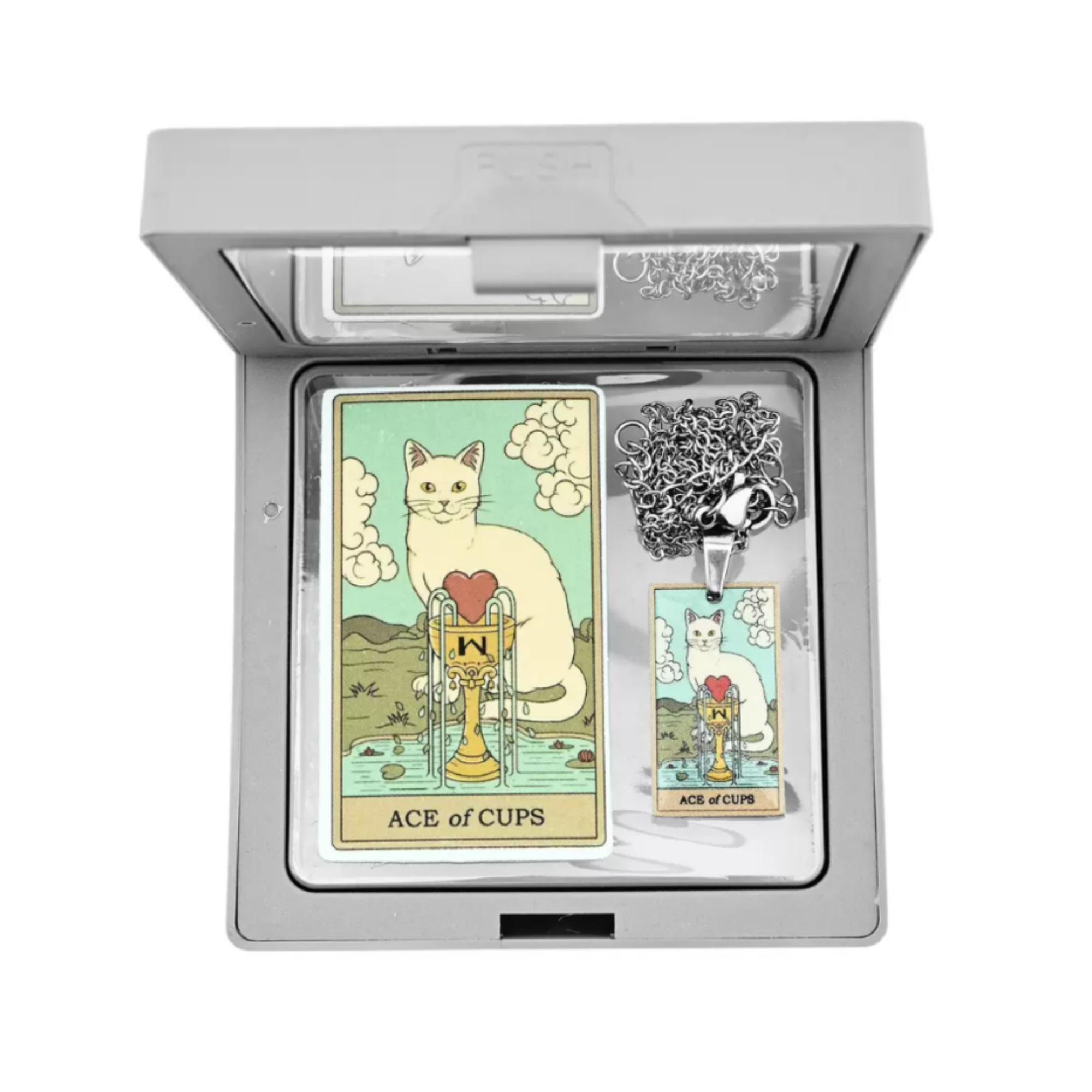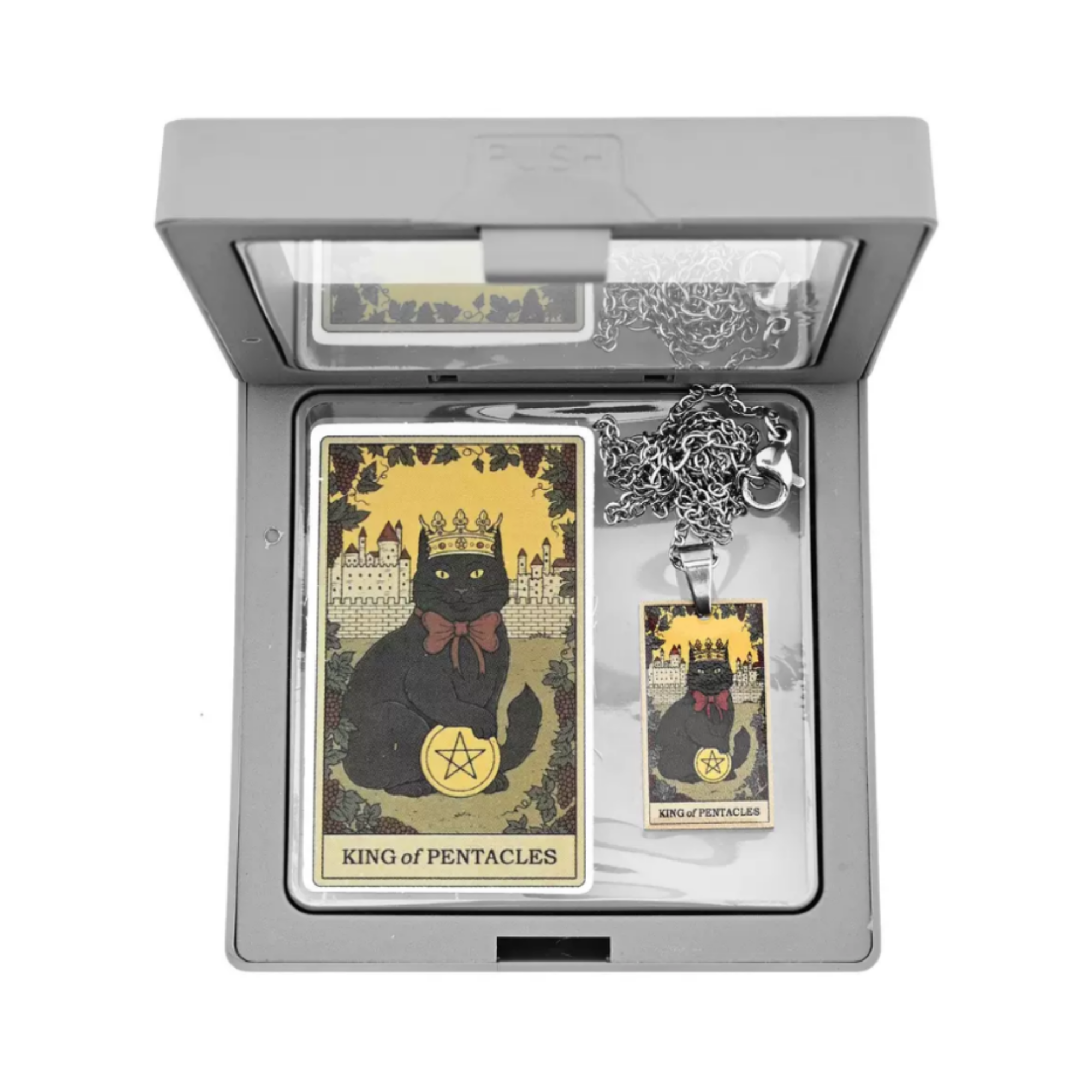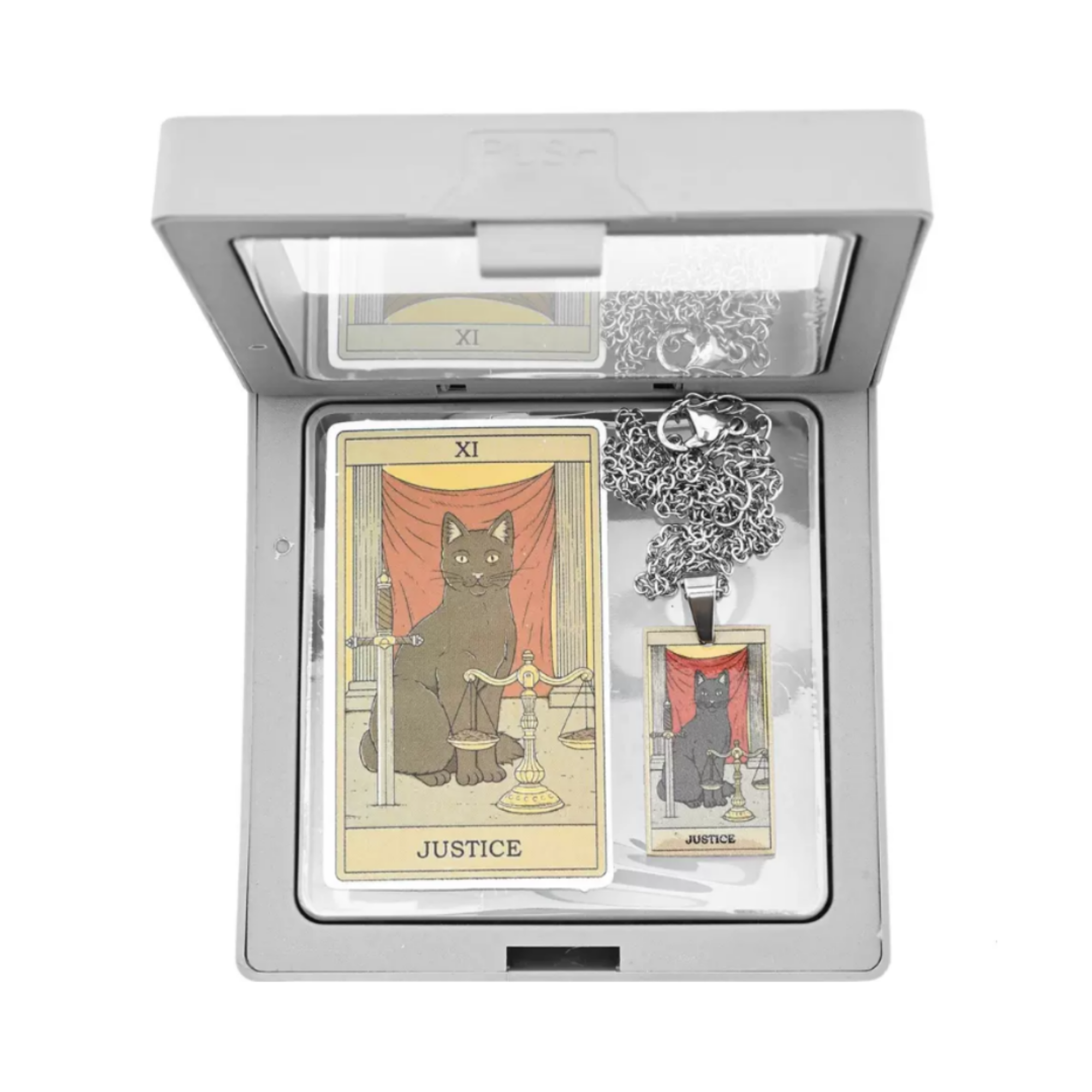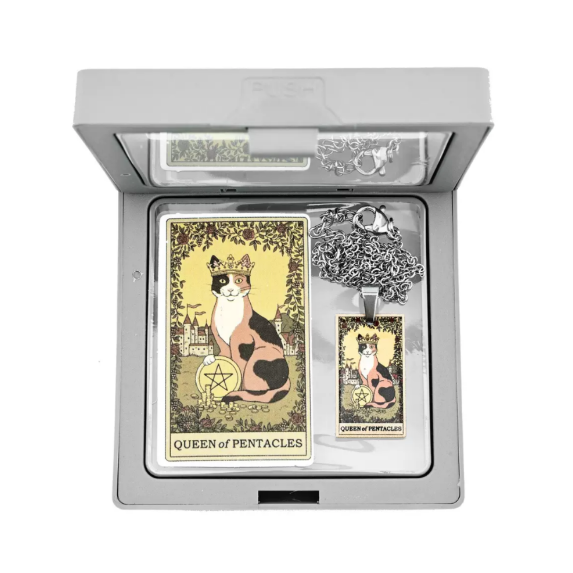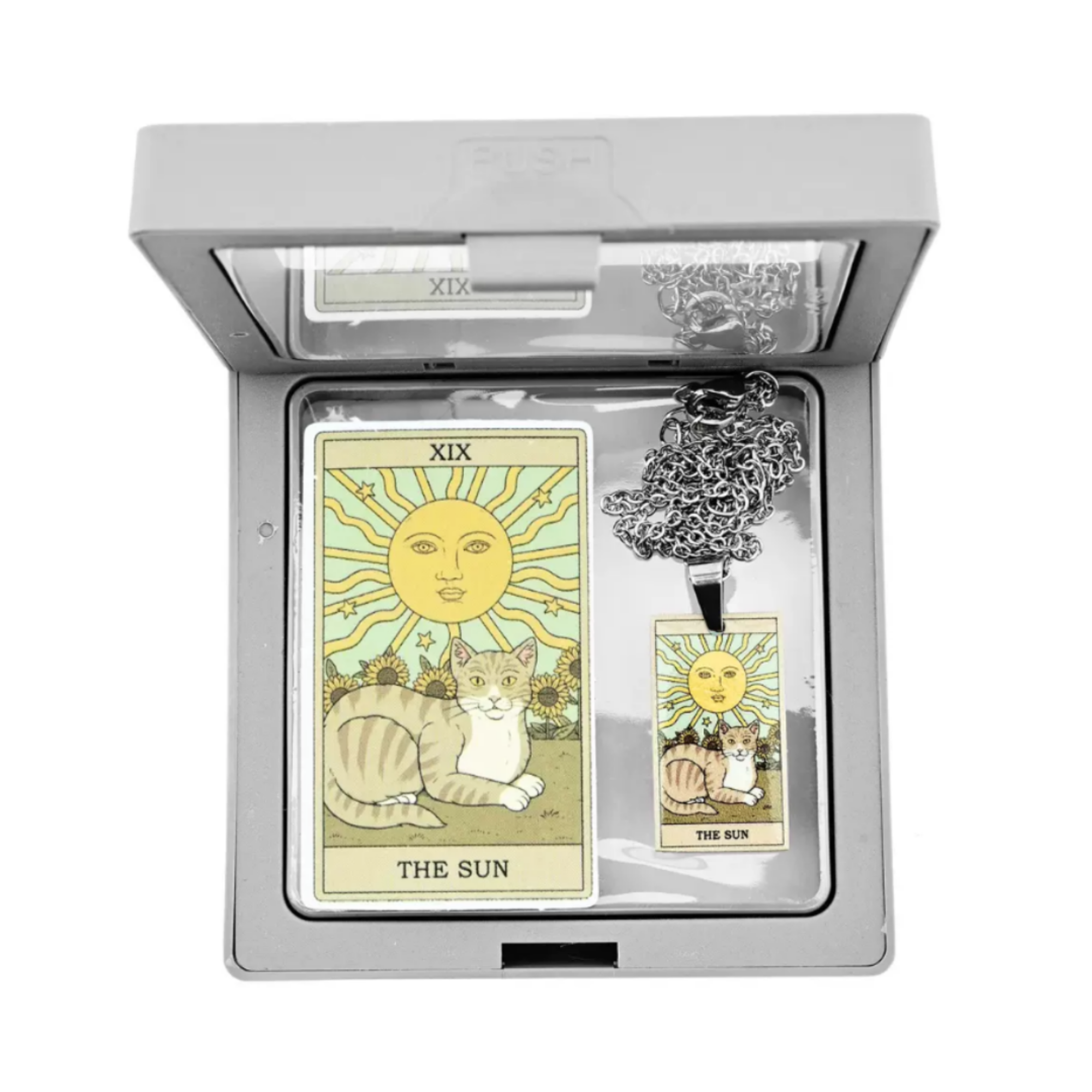 Box set of a necklace and the actual tarot card, it's the ideal gift for anyone who loves cats, cards, and a little cosmic magic.