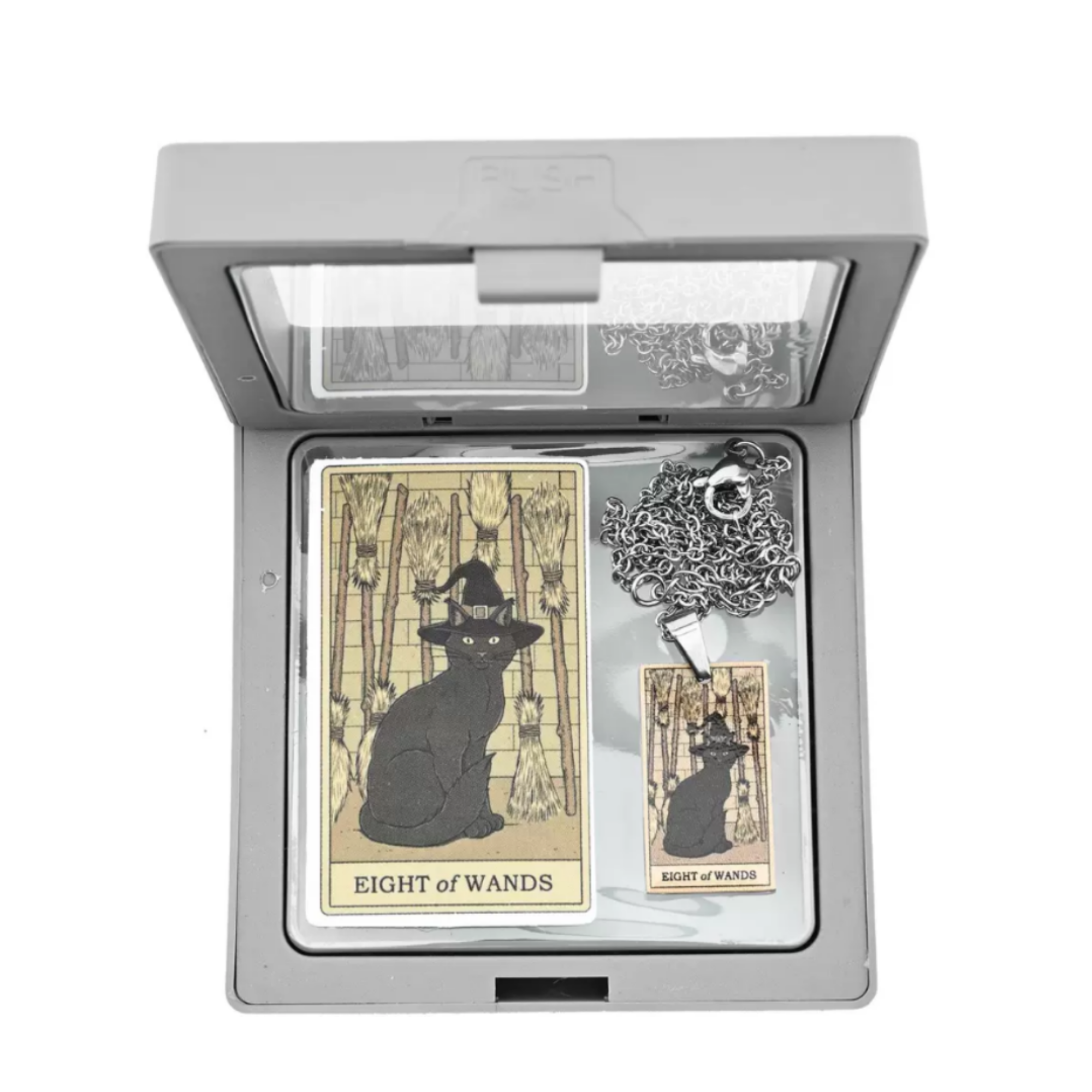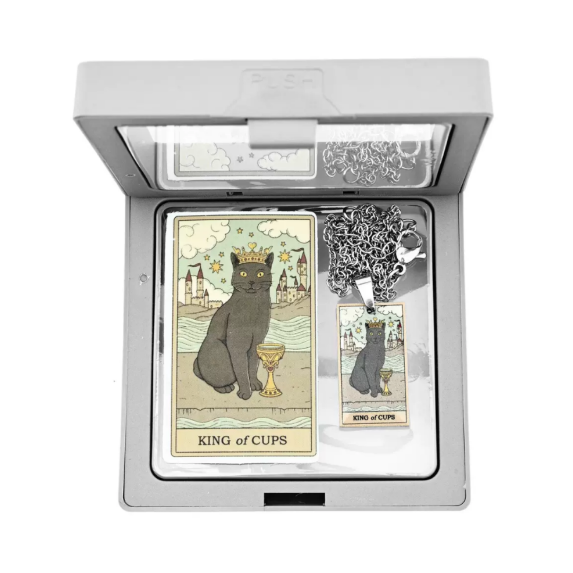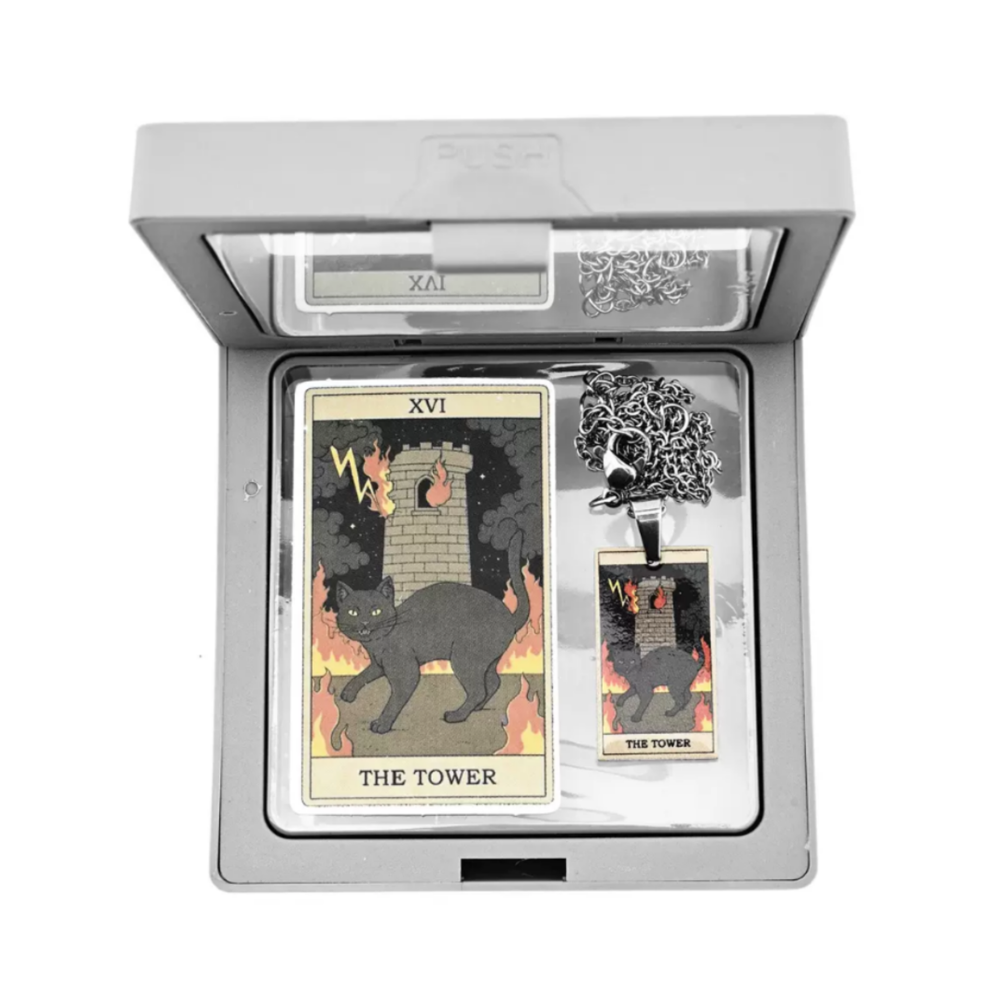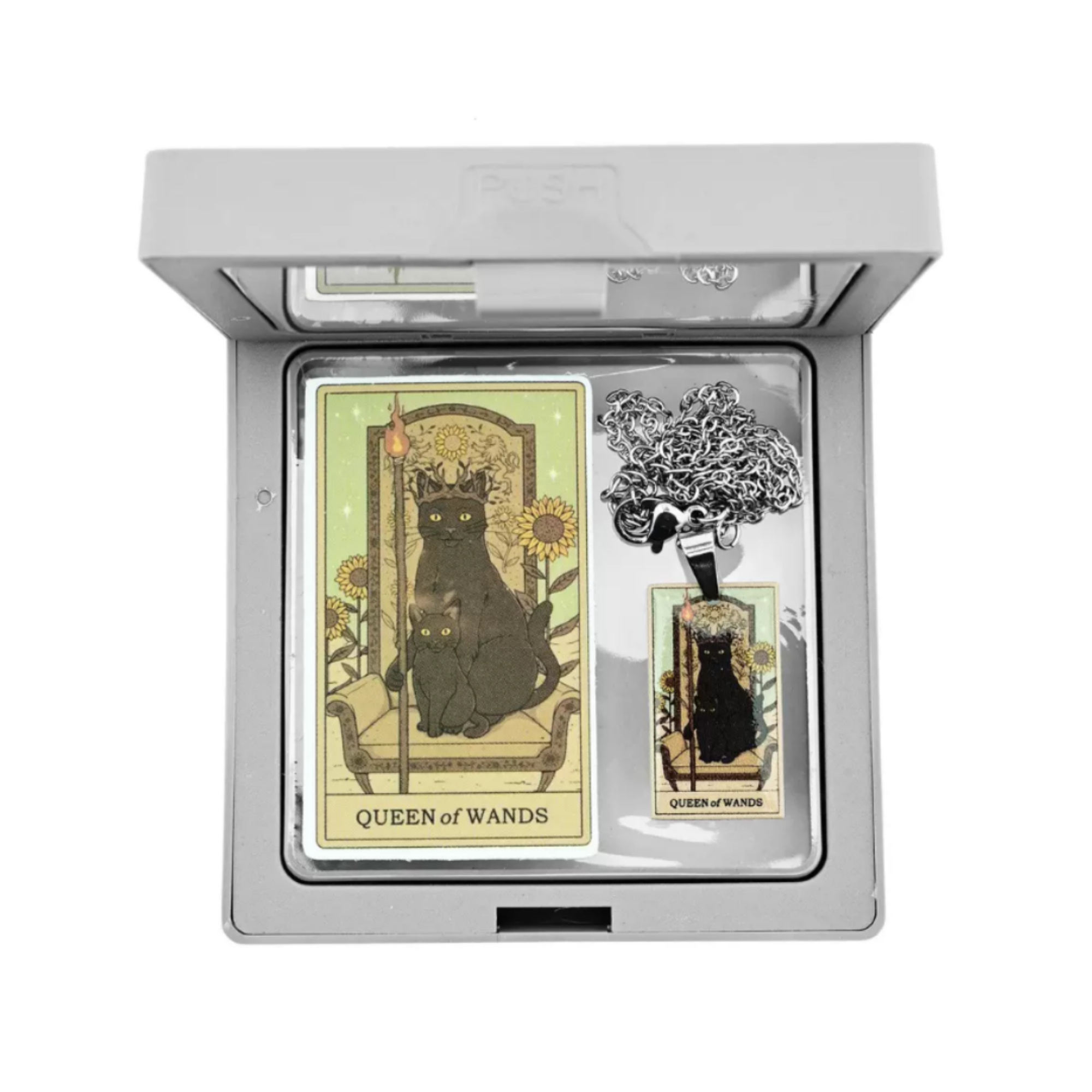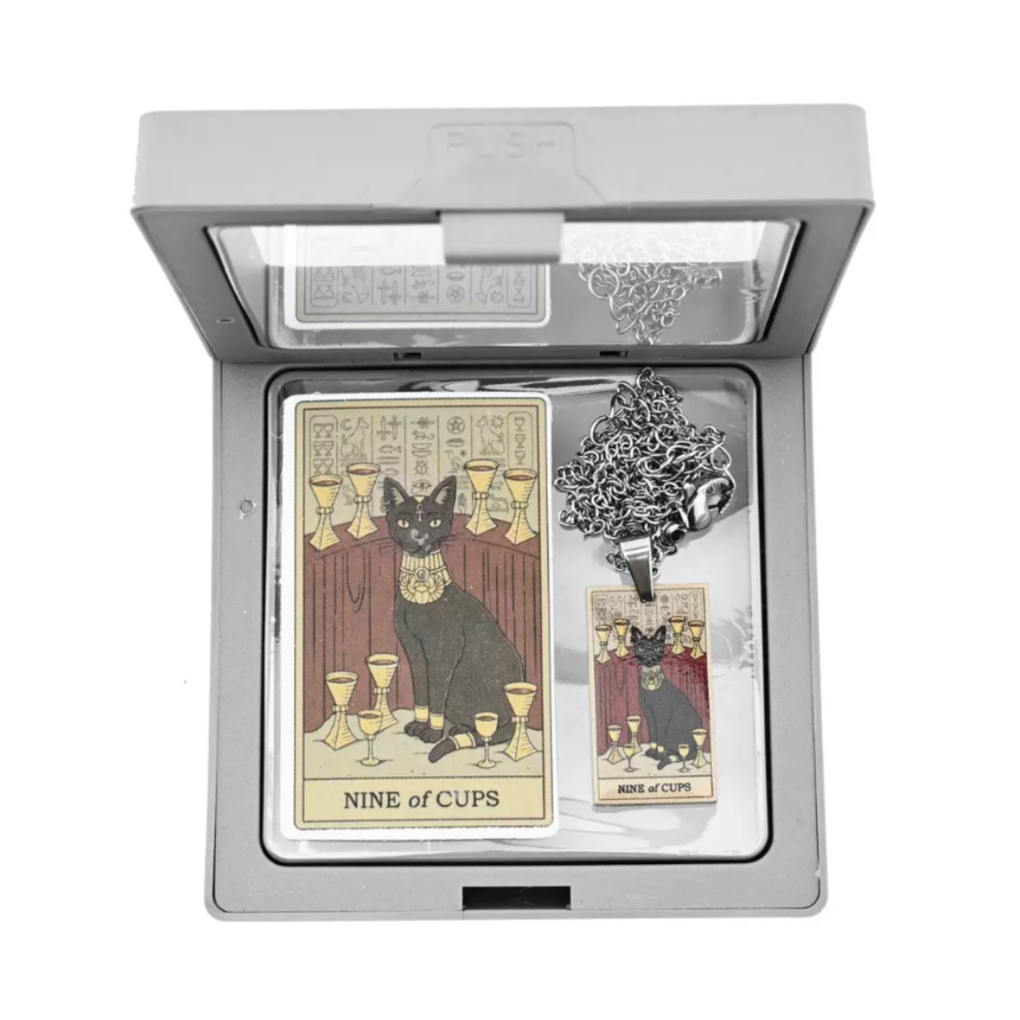 Box set of a necklace and the actual tarot card, it's the ideal gift for anyone who loves cats, cards, and a little cosmic magic.