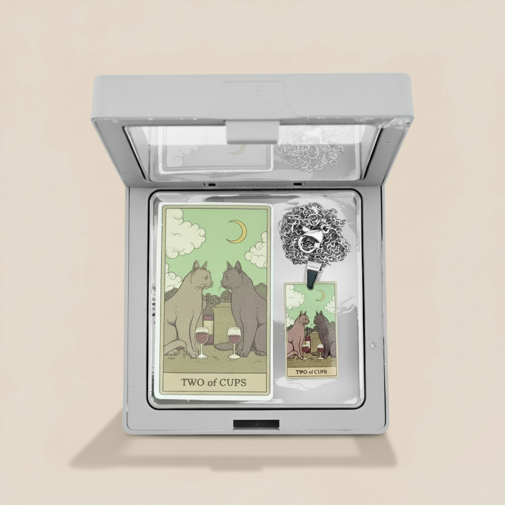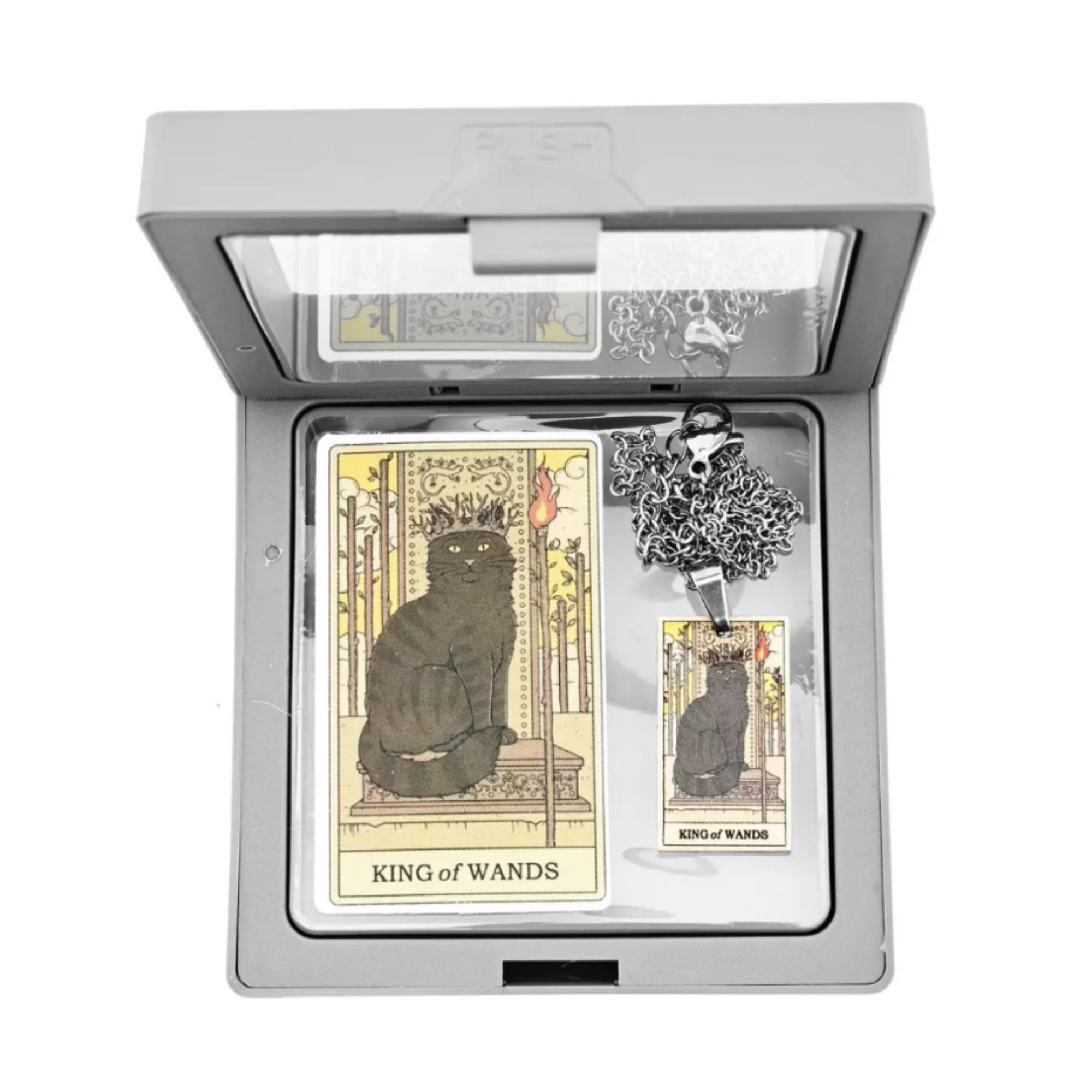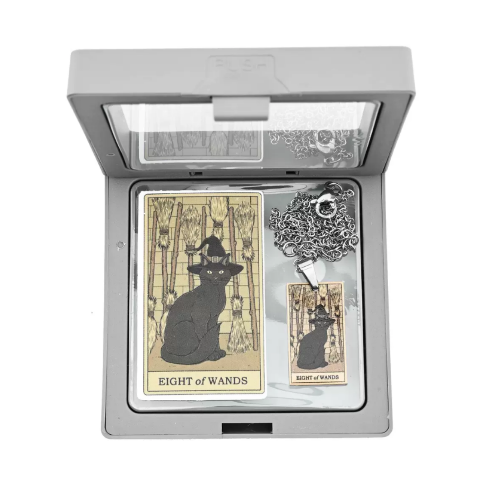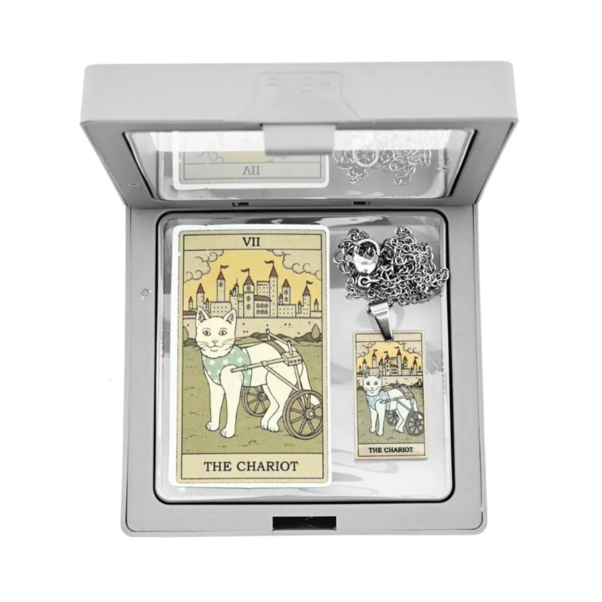 Box set of a necklace and the actual tarot card, it's the ideal gift for anyone who loves cats, cards, and a little cosmic magic.