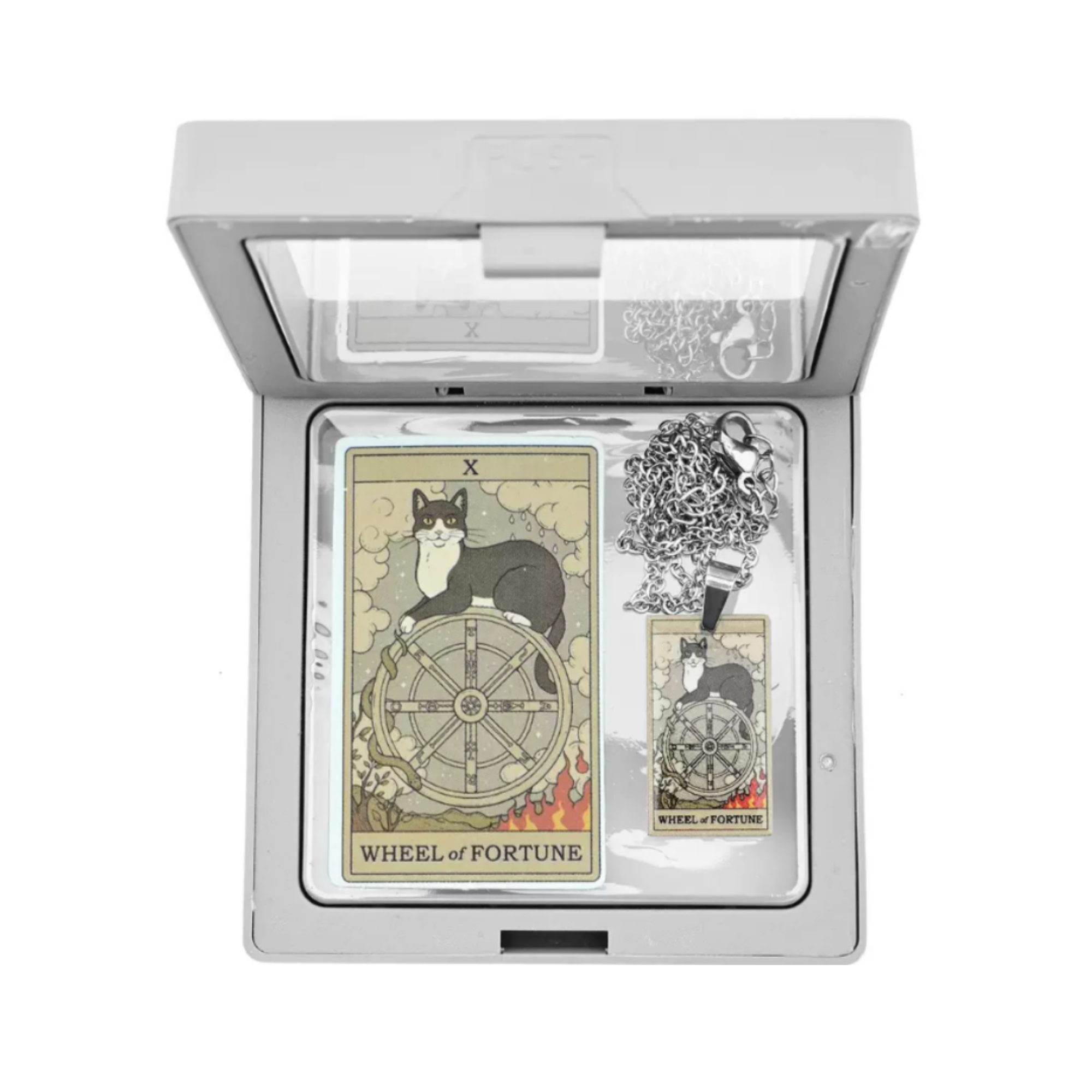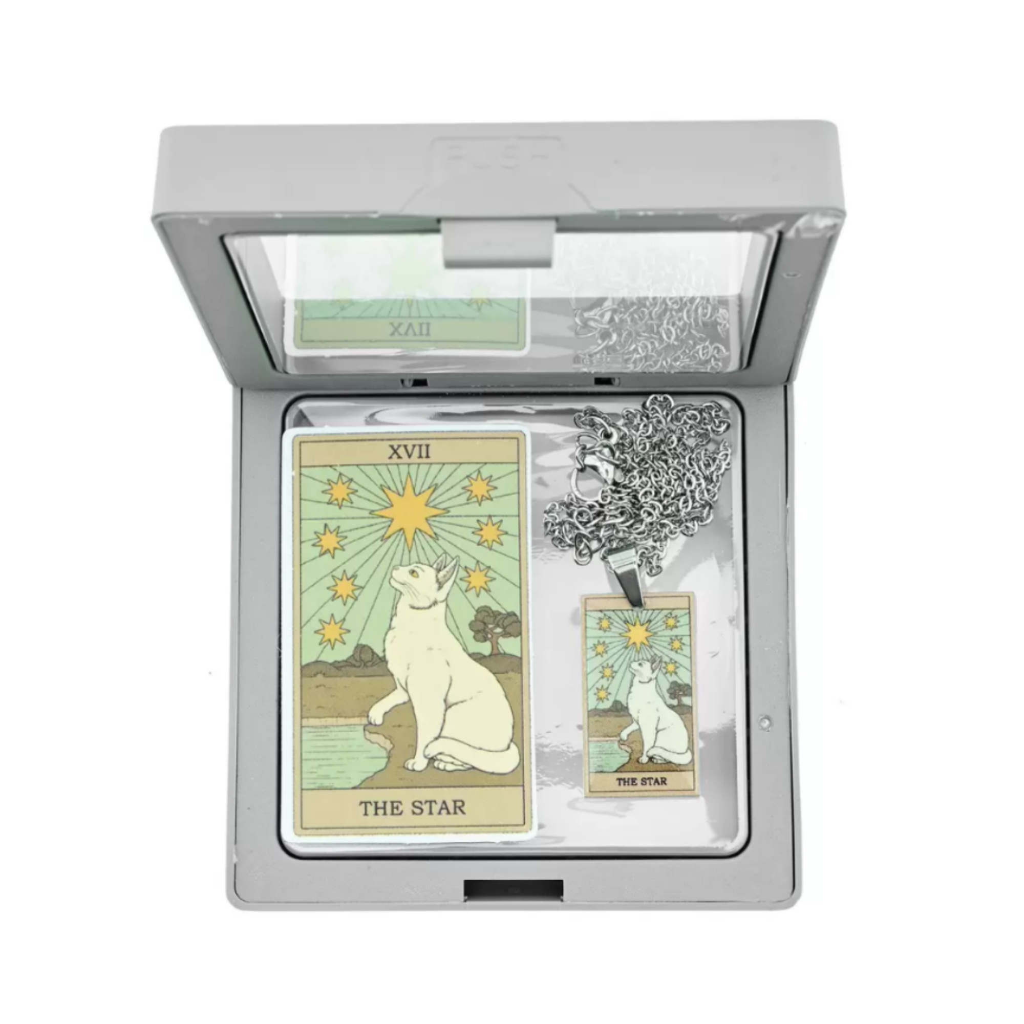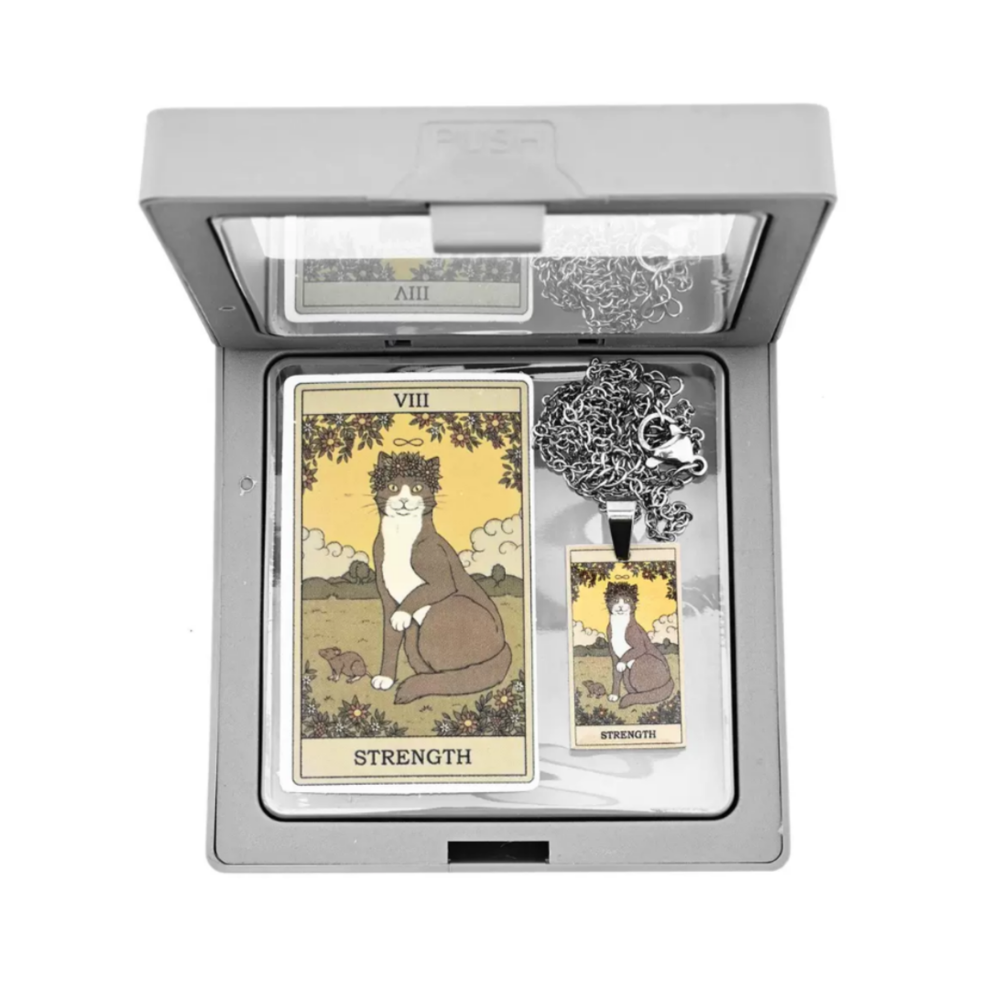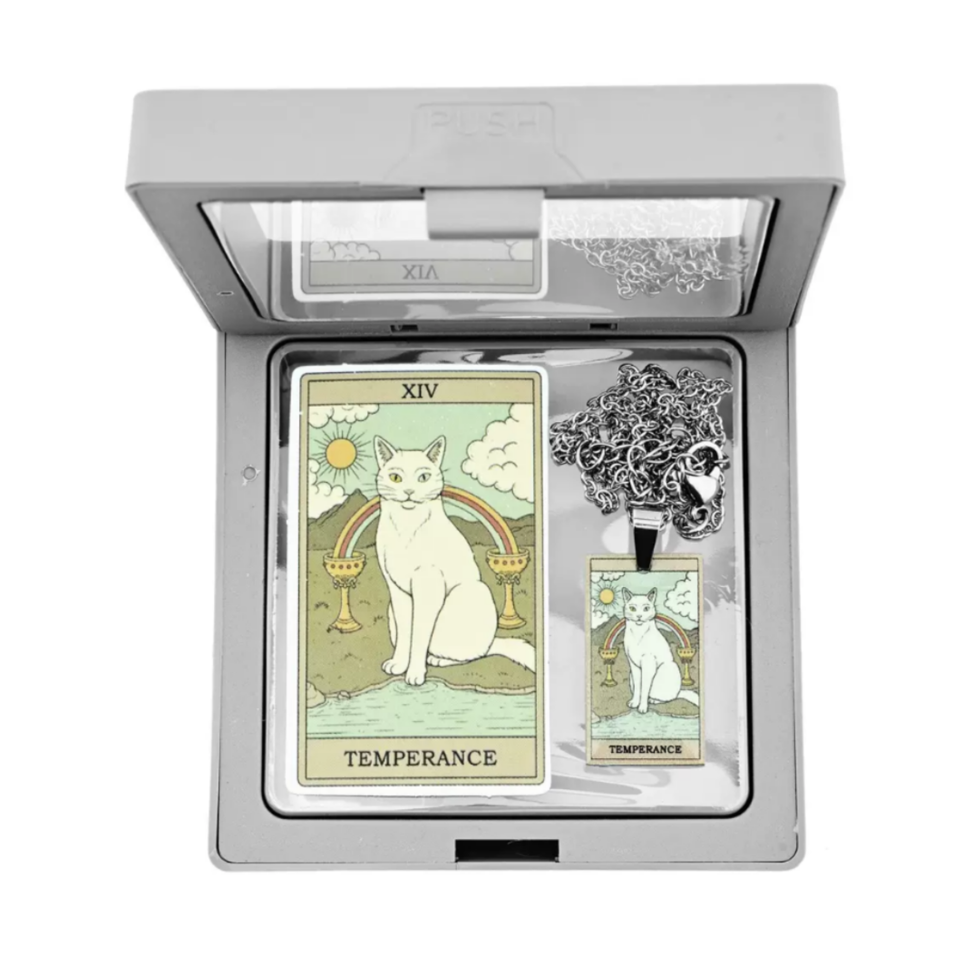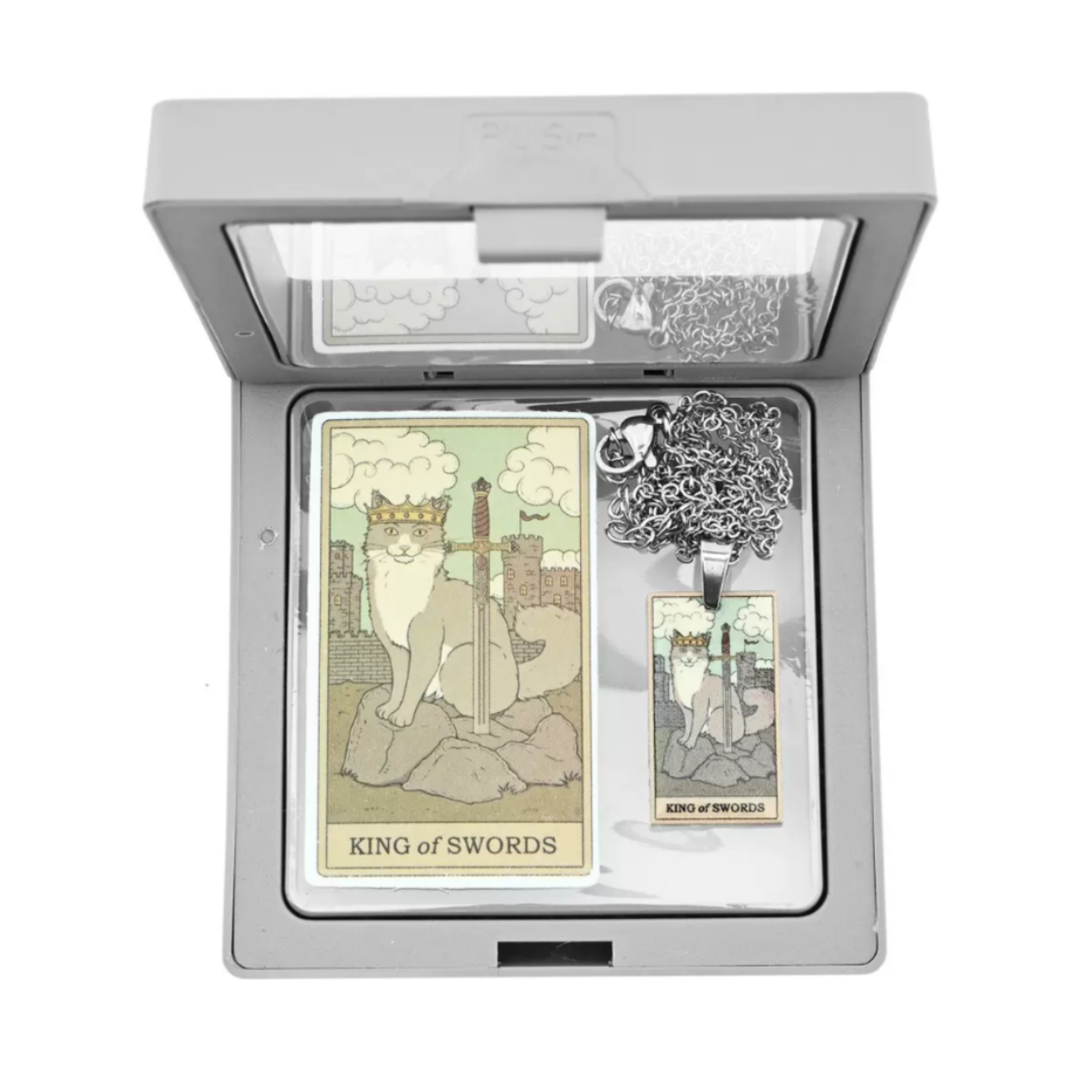 Box set of a necklace and the actual tarot card, it's the ideal gift for anyone who loves cats, cards, and a little cosmic magic.