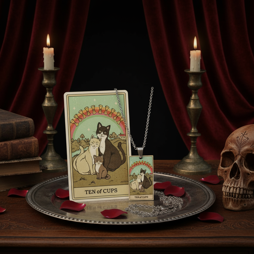 Exquisitely crafted necklace blendsĀ tarot symbolism with adorable cat designs