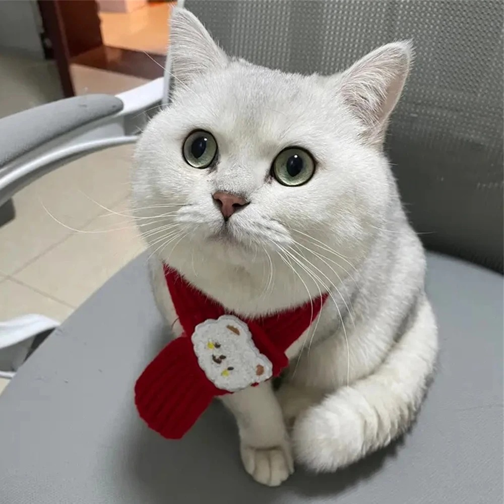Keep your furry friend warm and stylish this holiday season with the Festive Pet Scarf with Santa Charm! Designed for cats and small-sized dogs.