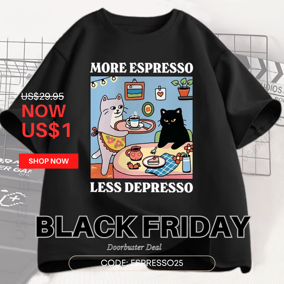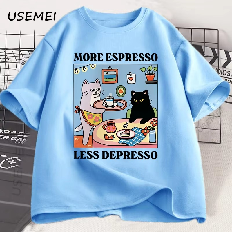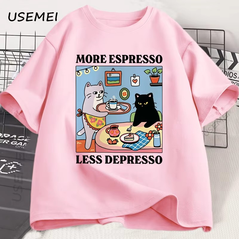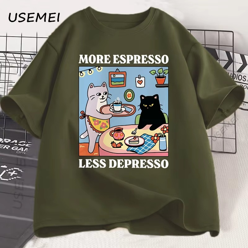 Calling all coffee-obsessed cat lovers! This playful tee celebrates the perfect pairing of espresso shots and feline charm with its witty "More Espresso Less Depresso" design.
