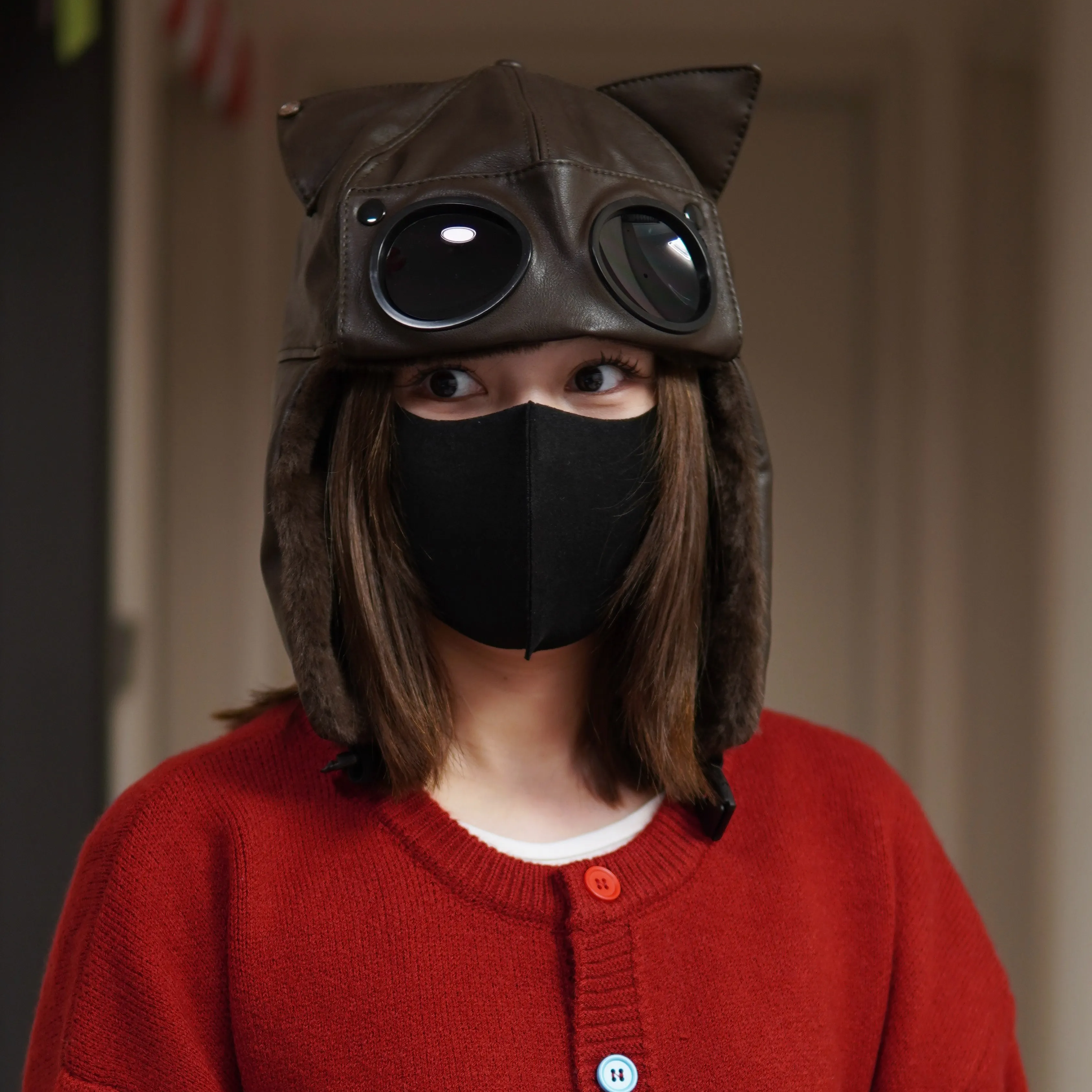 🖤 Futuristic Feline Look – Sleek leather style with cat ears and goggles.