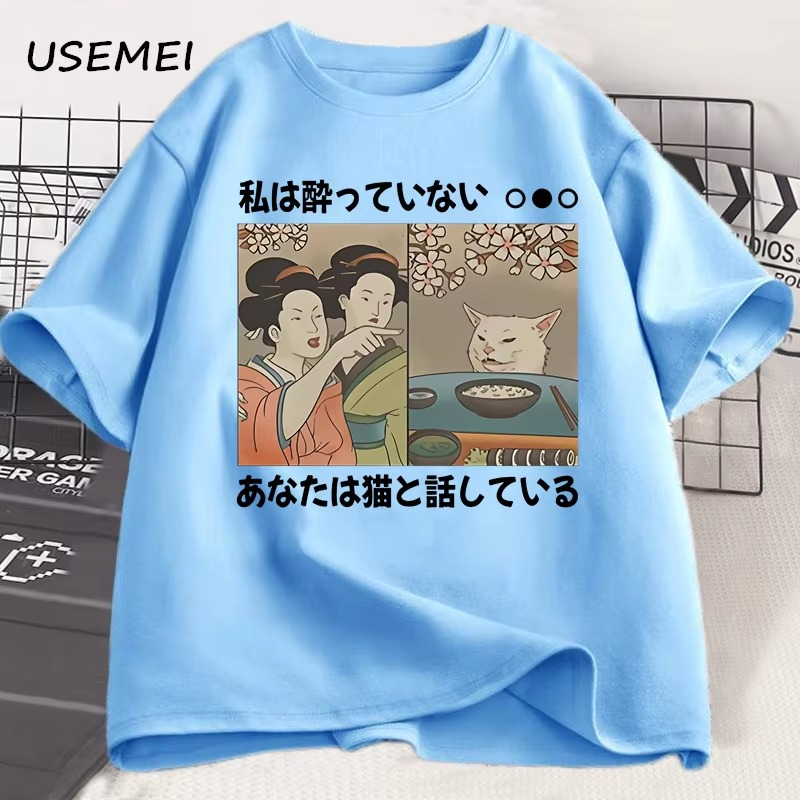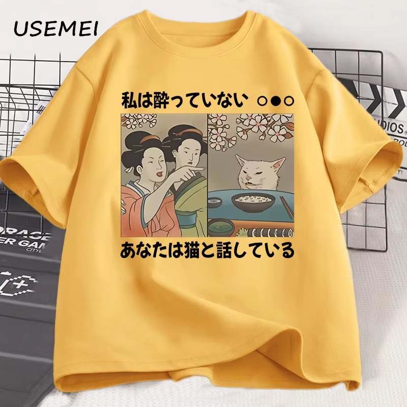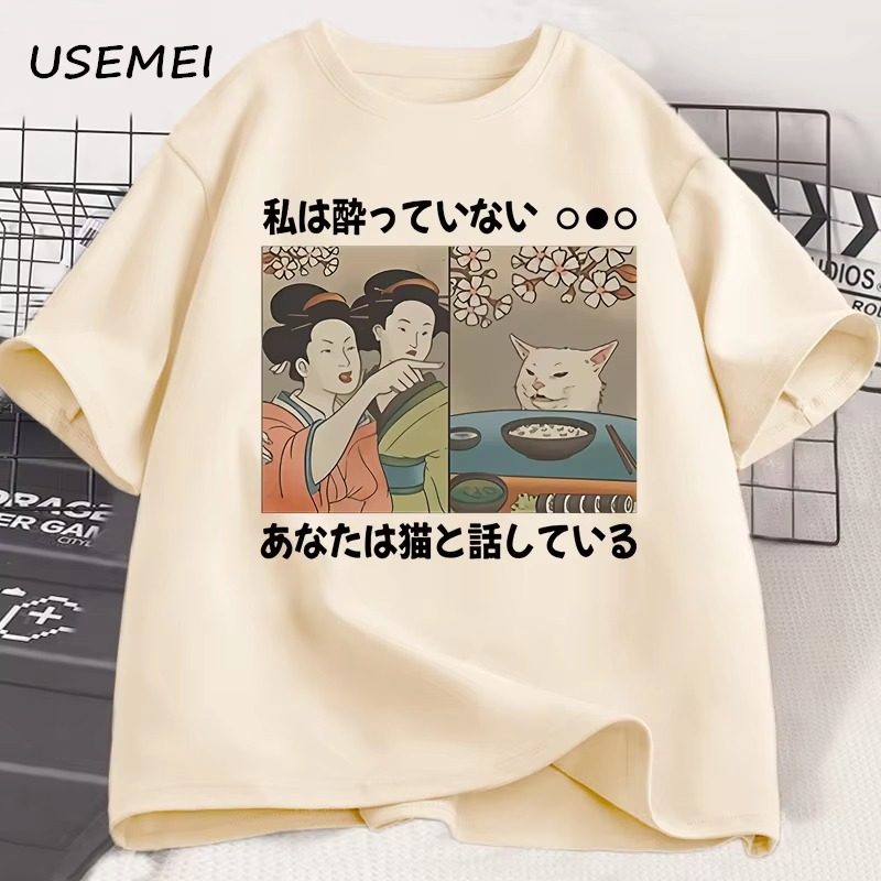 A playful tee featuring a hilarious cat meme print with a Japanese twist. .Available in a variety of colors and sizes up to 3XL, this cozy short-sleeve tee pairs perfectly with jeans, skirts, or oversized streetwear fits.