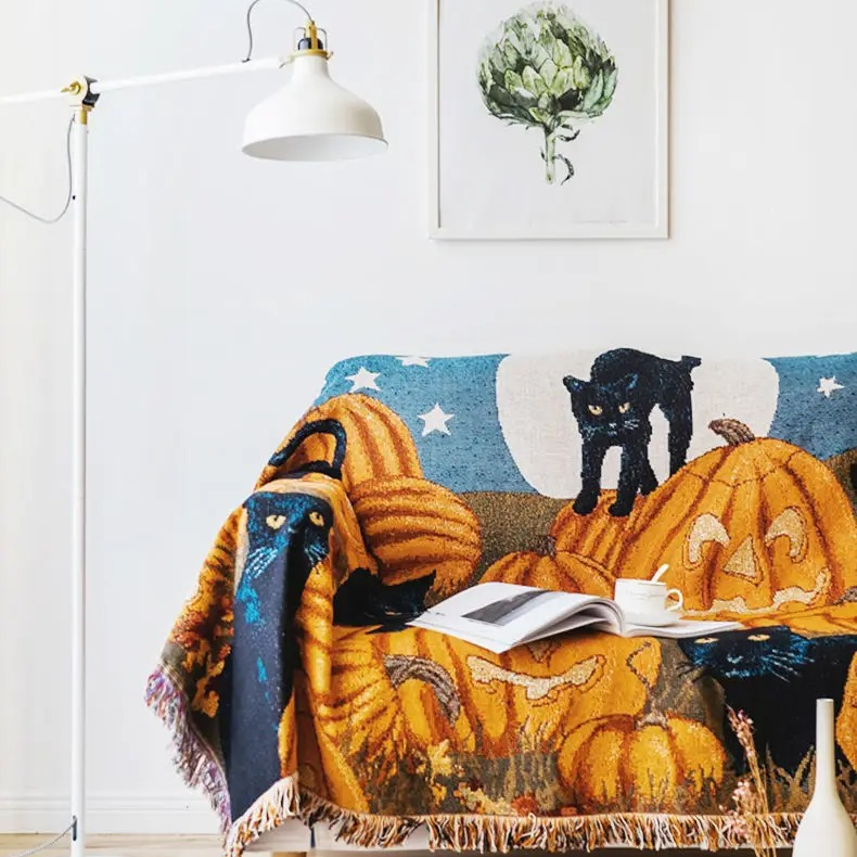 Transform your space into a Halloween haven with this enchanting Spooky Cat Pumpkin Tapestry! Adorned with mysterious black cats and luminous jack-o'-lanterns woven into its fabric, this versatile throw brings festive flair to your décor.